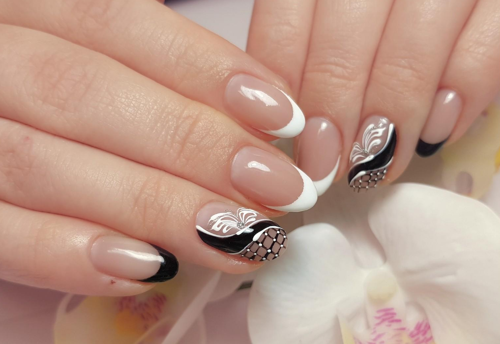Черно-белым френчем можно украсить каждый ноготок (имеется в виду их форма и длина). Главное – подобрать правильный дизайн для женщины. Декор призван «разбавлять» строгий черно-белый дизайн.
