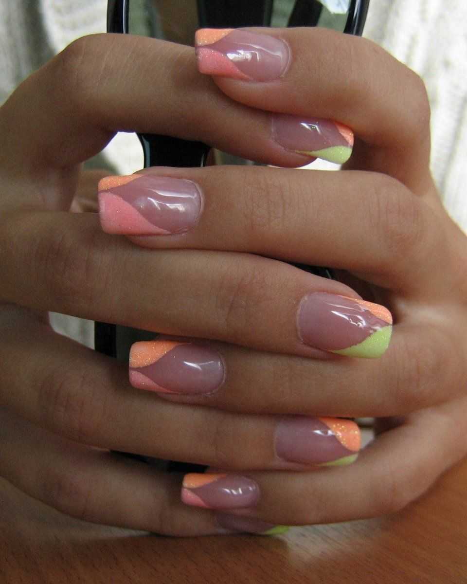 Для французского маникюра имеются привычные оттенки (белый и нюдовый тон). Но сегодня мода прогрессирует все быстрей и быстрей. Дизайн ногтей идет в ногу с модными тенденциями. Именно поэтому привычные оттенки французского маникюра сменились на разнообразные оттенки. К примеру, стиль твист подразумевает в себе не только разноцветие улыбки, но и яркие фоны. Для идеального дизайна французского маникюра используют различные виды декора: камни, трафареты, стразы, ленты, глиттер и пигменты с разнообразными эффектами. Для создания оригинального квадратного маникюра используют роспись в ручном исполнении. Дизайн делается в виде абстракции, узора или конкретного рисунка.