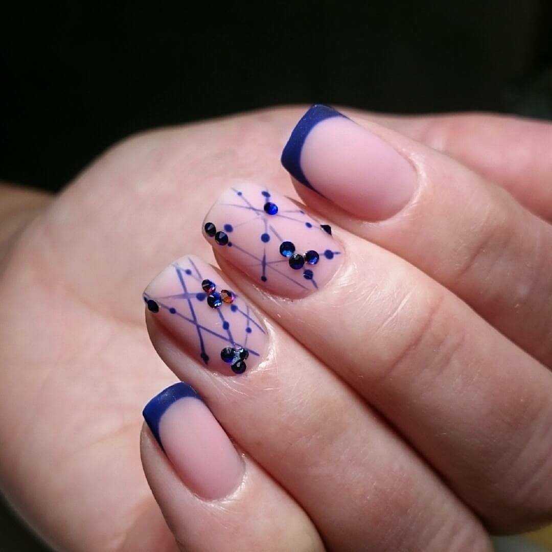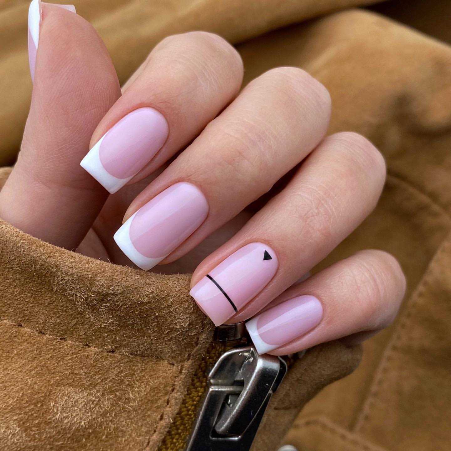 Френч в сочетании с геометрией может быть не на каждом ногте. Идеальный вариант исполнения — френч на нескольких пальцах с геометрическими линиями, остальные ногти покрыты основным цветом с рисунком или без него.