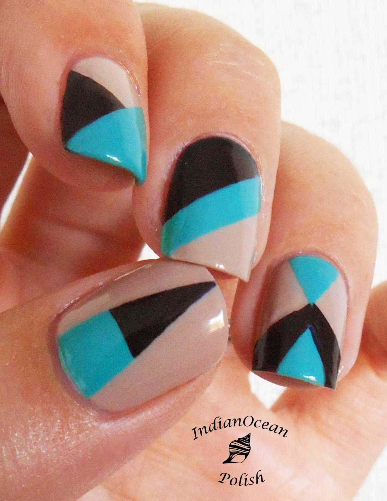 • Обозначать полосками ленты границу фрагмента геометрического рисунка нужно аккуратно, контролируя плотность прилегания полоски. В обратном случае лак может попасть под наклейку, смазав тем самым границу.