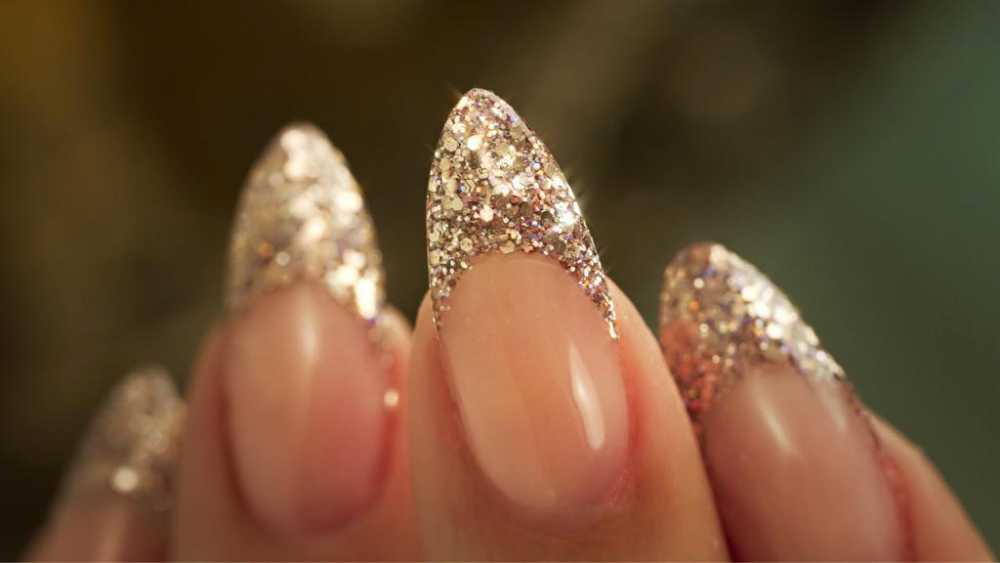 Для френча с блеском на концах ногтей глиттер можно наносить россыпью или крепить подетально крупные частицы.