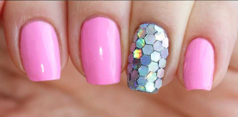 Каждая девушка сможет легко выполнить в домашних условиях маникюр с блестками. Можно использовать самые разнообразные идеи дизайна, главное, не бояться экспериментов. К примеру, очень интересно и стильно смотрится рисунок, который заполнен яркими блестками. В данном случае лучше использовать мелкий шиммер и тонкую кисточку, которой их будет удобно наносить. Можно создать рисунок самостоятельно или воспользоваться специальным трафаретом, если не умеете рисовать.