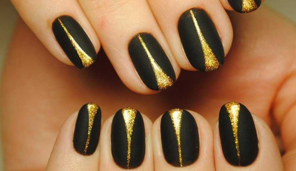 Но дополнительные цвета должны быть контрастными, чтобы в результате получить красивый геометрический рисунок. Золотыми блестками можно выделить контур рисунка, придав маникюру яркость и оригинальность.