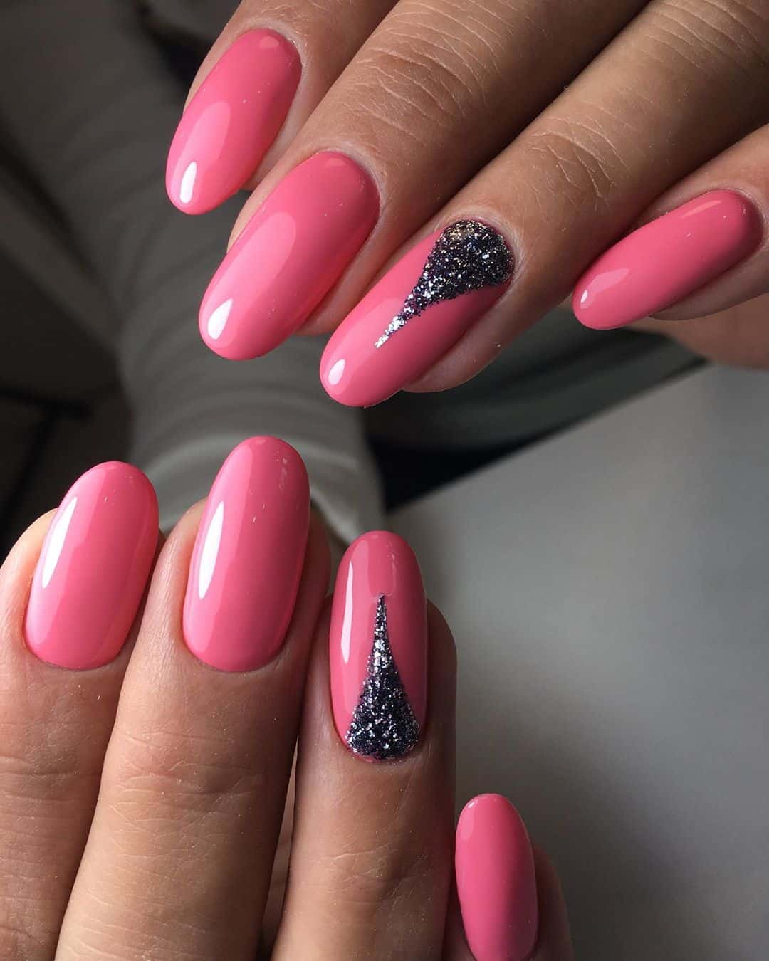 - Декорирование стразами или камнями – любое однотонное покрытие способны украсить различные камни или стразы, здесь главное не переборщить, выделяя только один ноготь или же использовать на каждом пальце. Декор наносится на завершающем этапе на липкий слой гель-лака, можно воспользоваться специальным клеем, после чего просушить в УФ-лампе. Затем поверхность закрепить слоем топового покрытия и снова просушить.