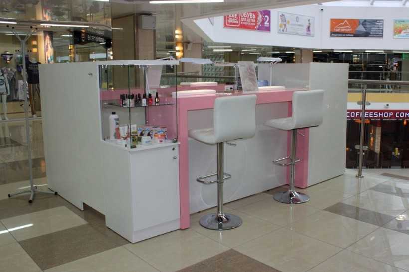 Экспресс-маникюр (нейл-бар). Открытые стойки в торговых центрах. Преимущество — расположение в зоне высокой проходимости. Недостатки — дорогая аренда, психологический фактор (многие клиенты не могут расслабиться при проведении косметических процедур у всех на виду), репутация бюджетного заведения (многих отталкивает). Бизнес невозможно расширить.