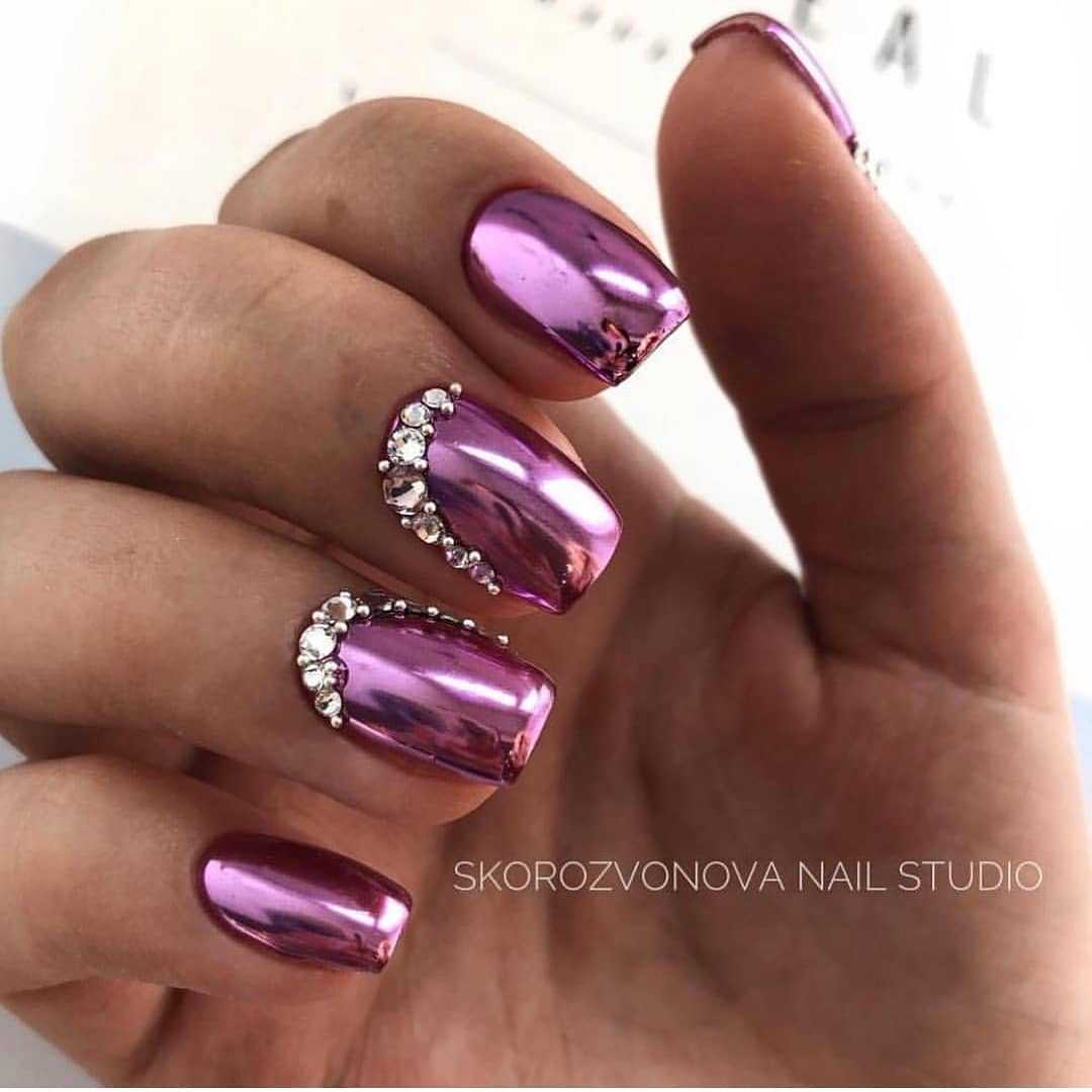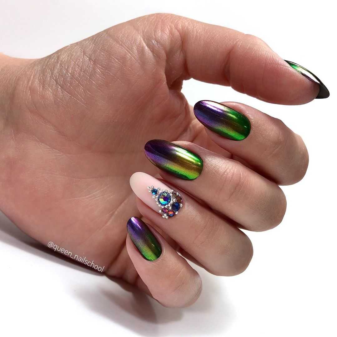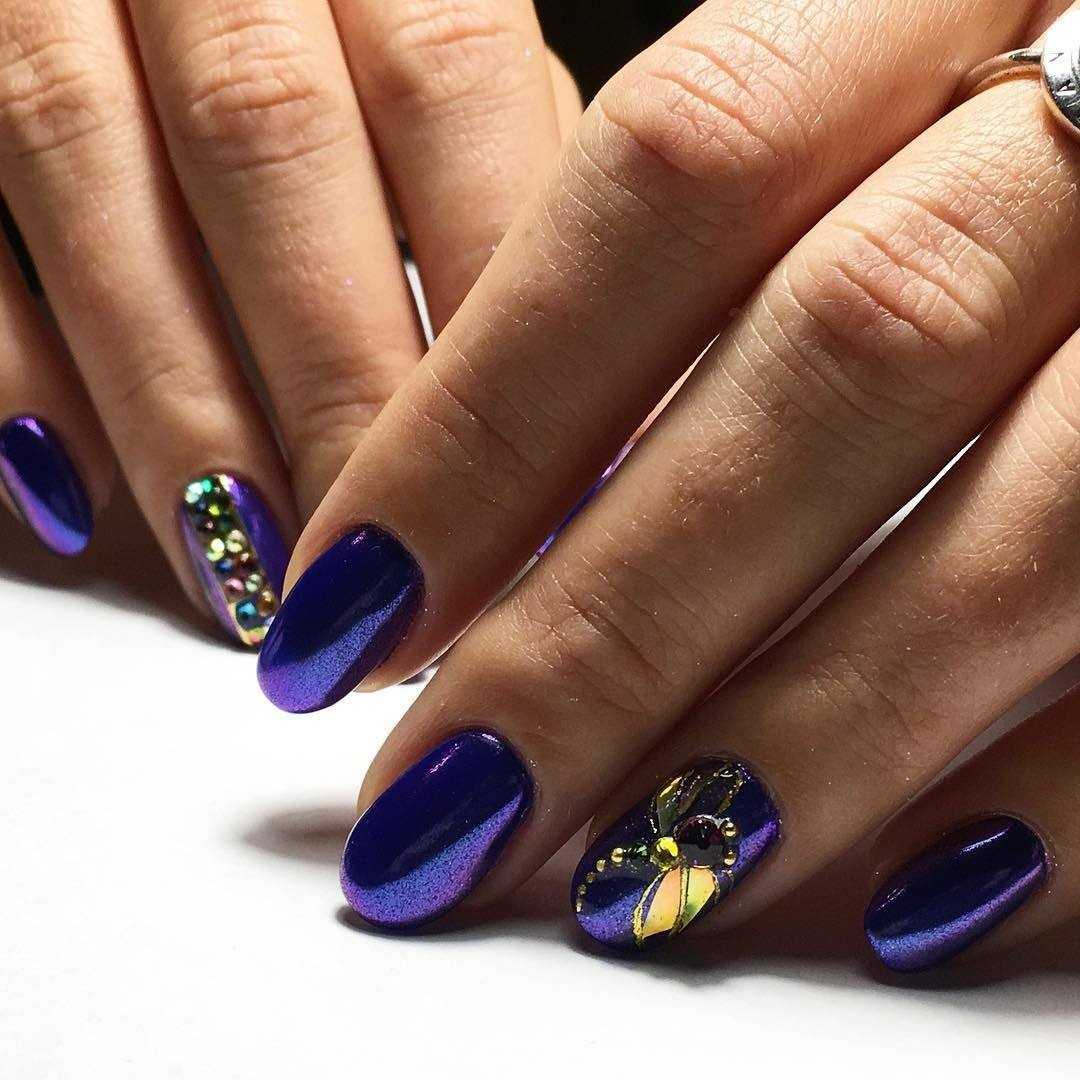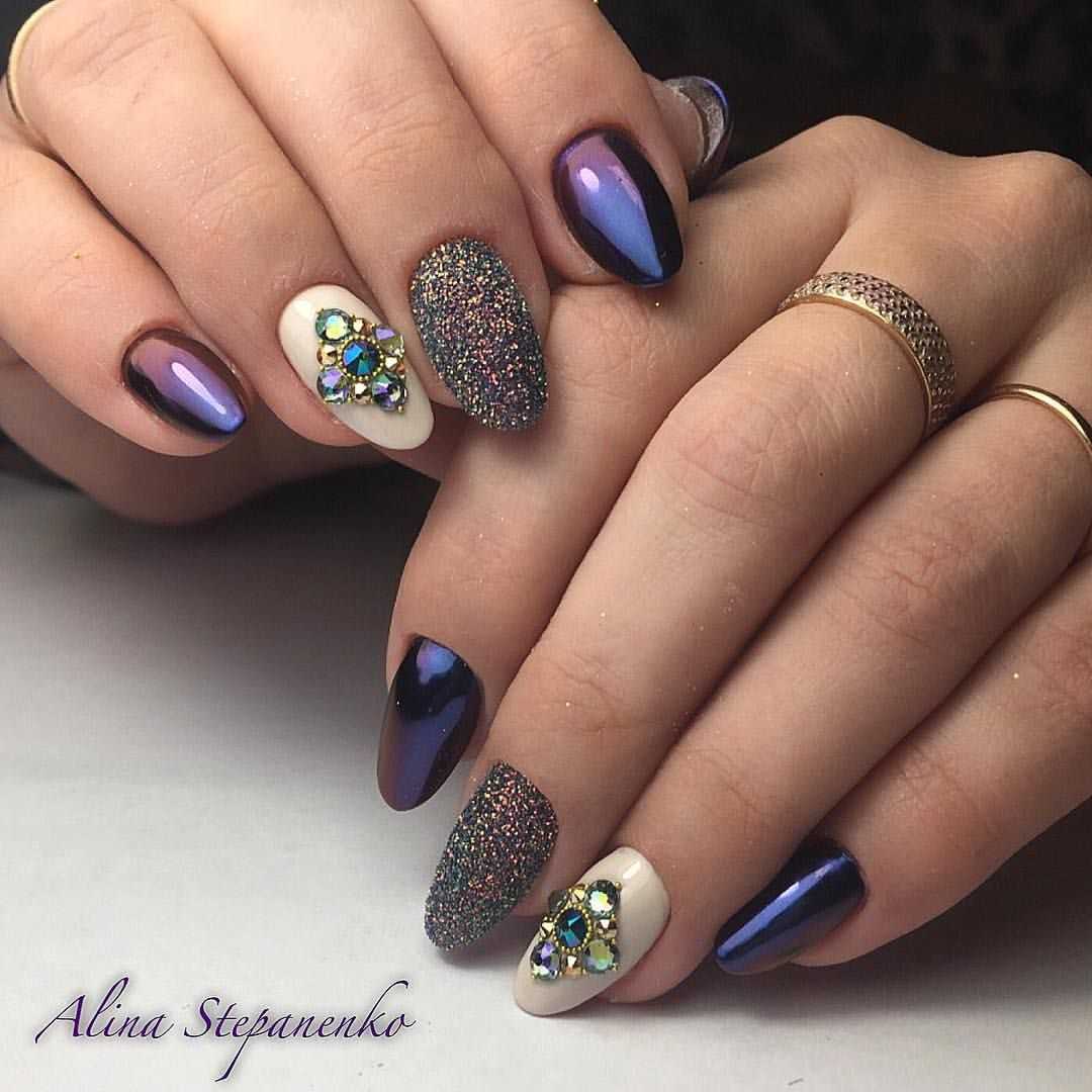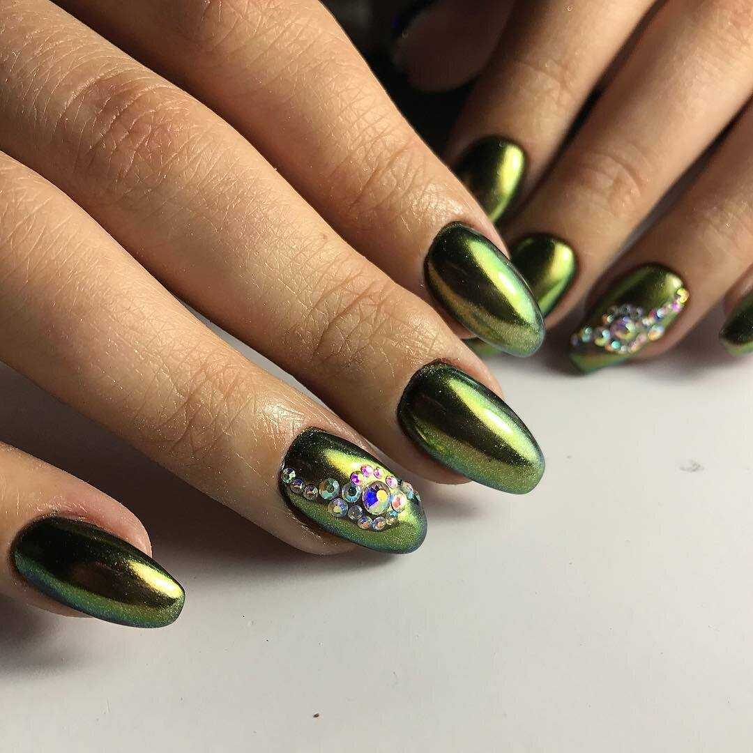 Дизайн ногтей из втирки всех оттенков отлично сочетается со стразами, на переливающихся ноготках блеск кристаллов выглядит экзотично и эффектно.