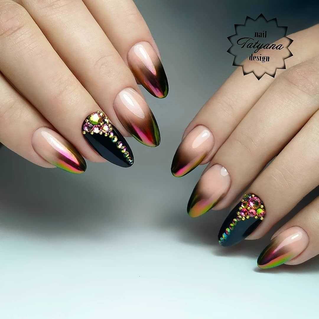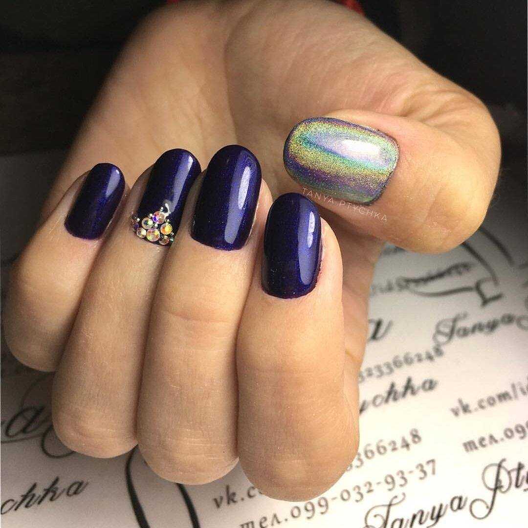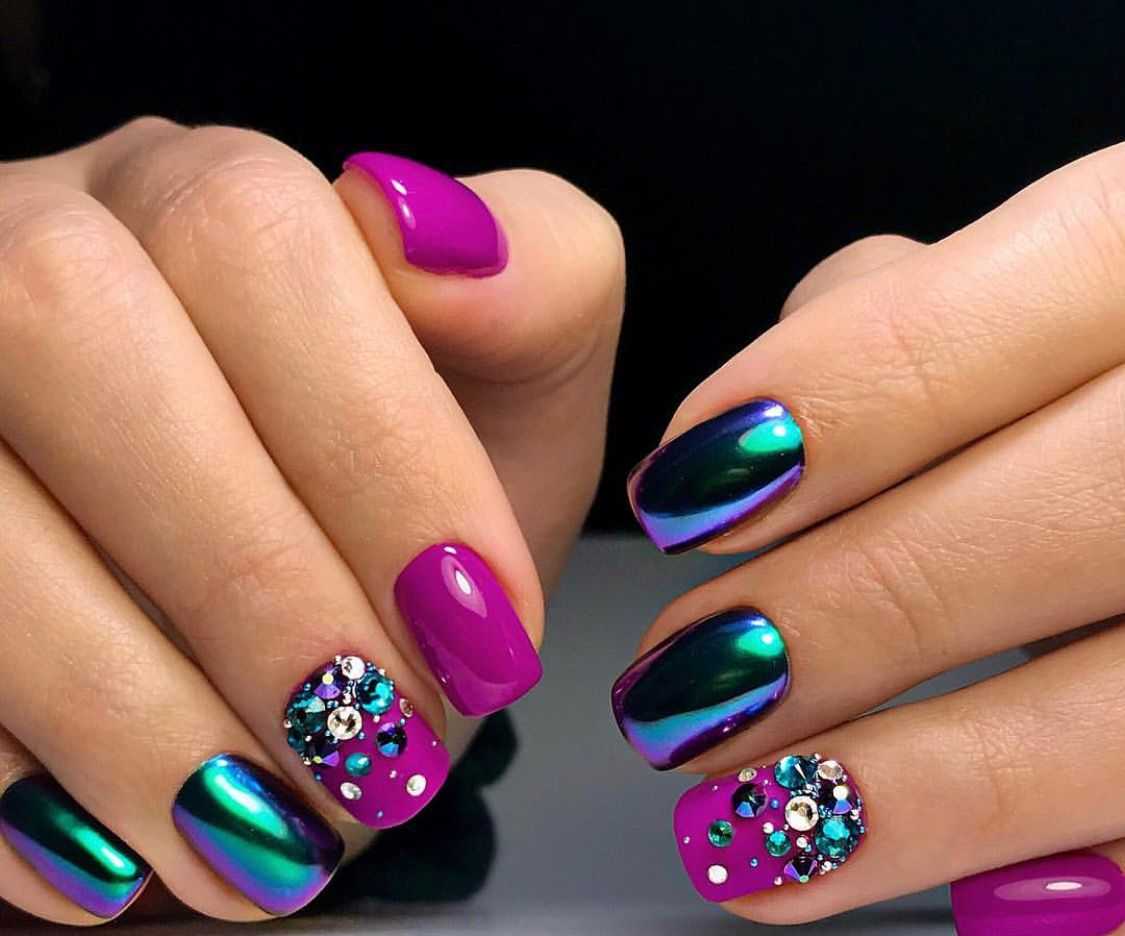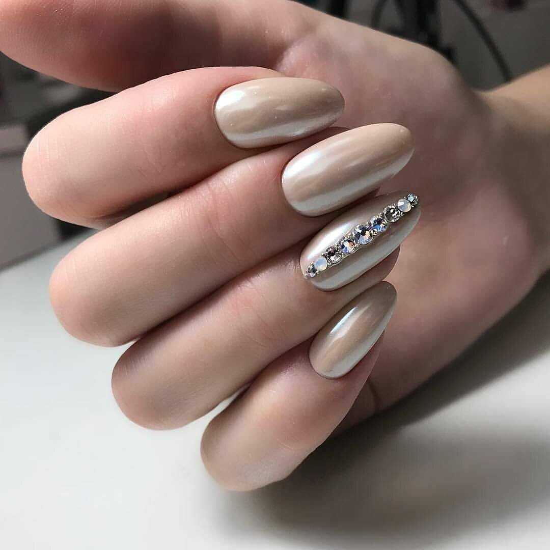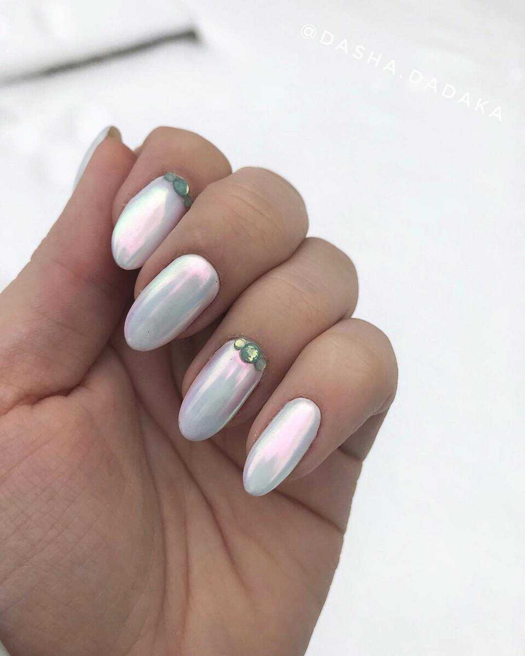 Дизайн ногтей из втирки всех оттенков отлично сочетается со стразами, на переливающихся ноготках блеск кристаллов выглядит экзотично и эффектно.