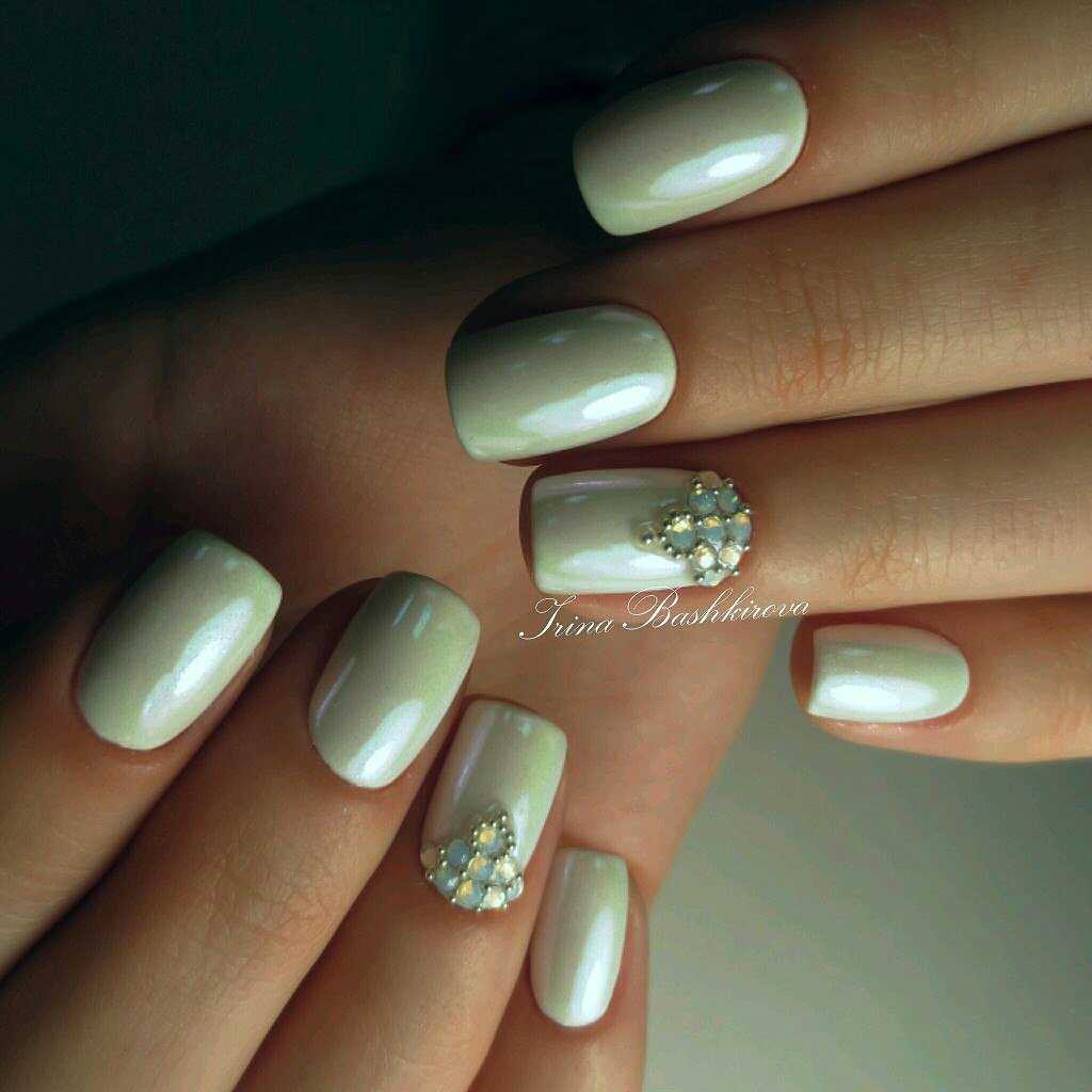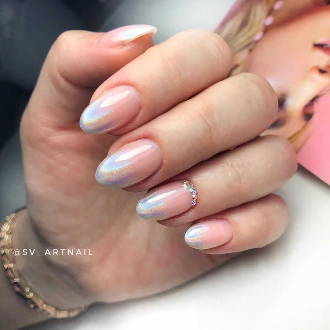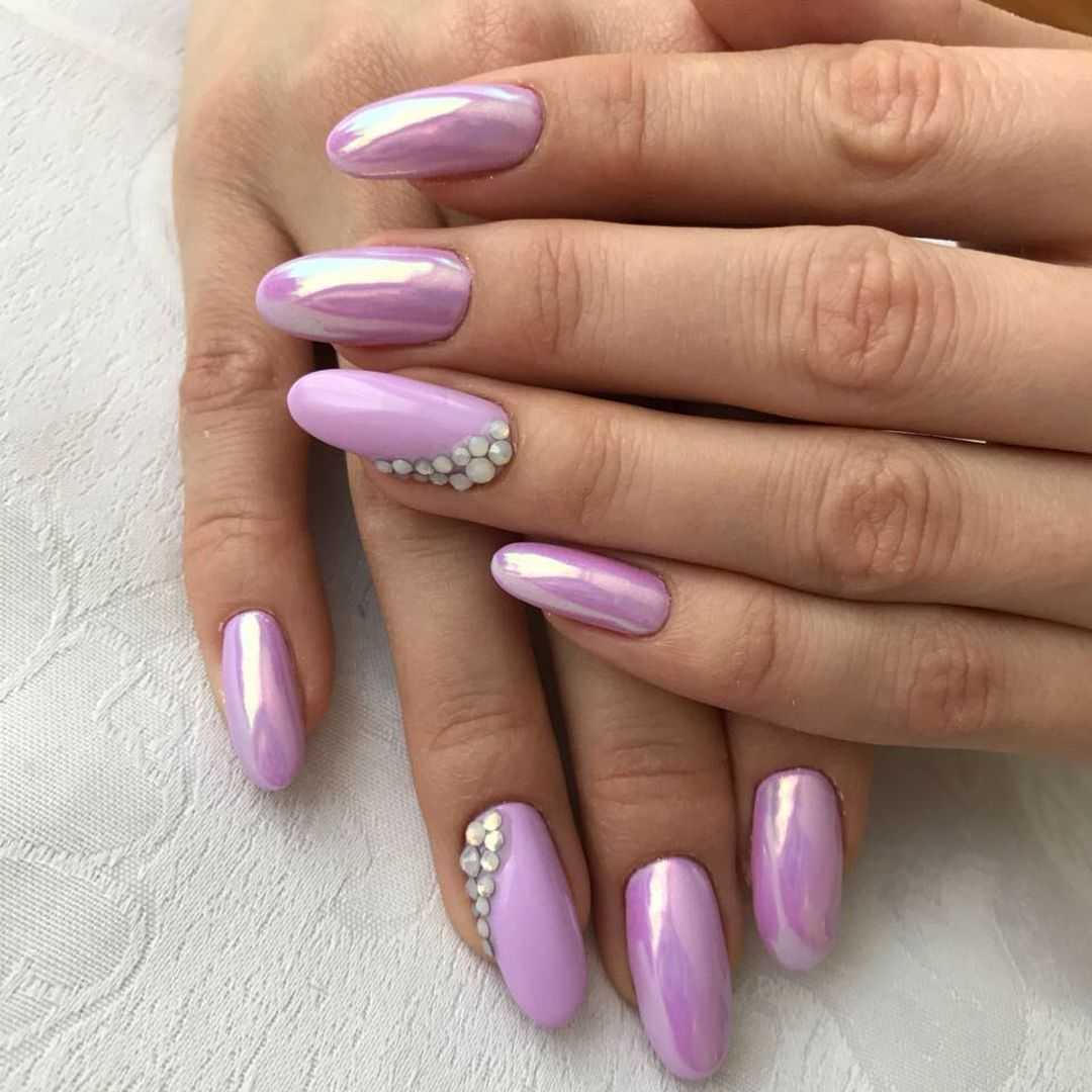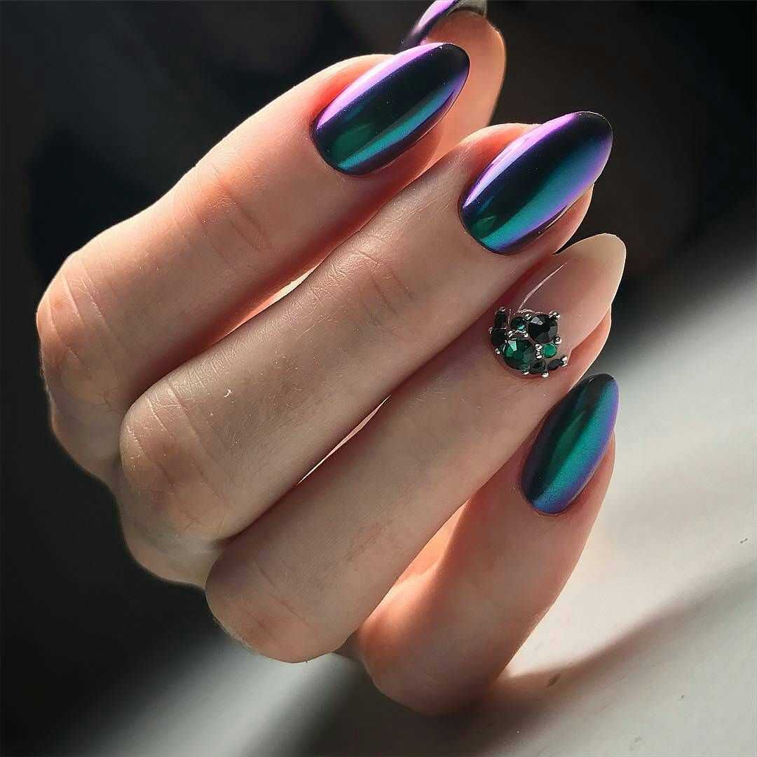 Дизайн ногтей из втирки всех оттенков отлично сочетается со стразами, на переливающихся ноготках блеск кристаллов выглядит экзотично и эффектно.