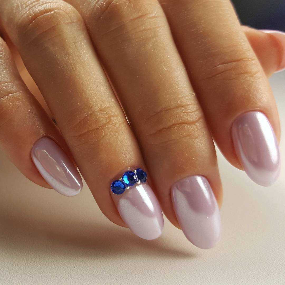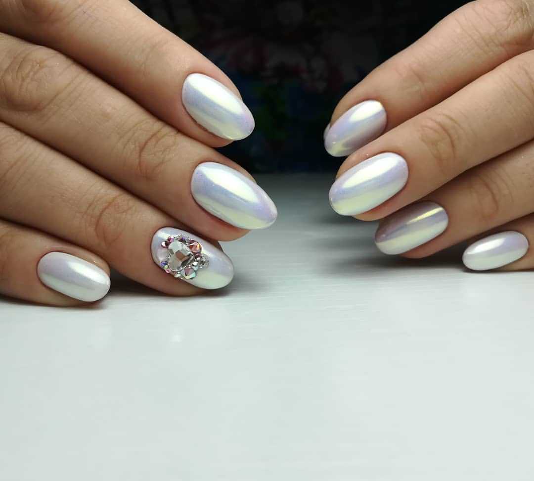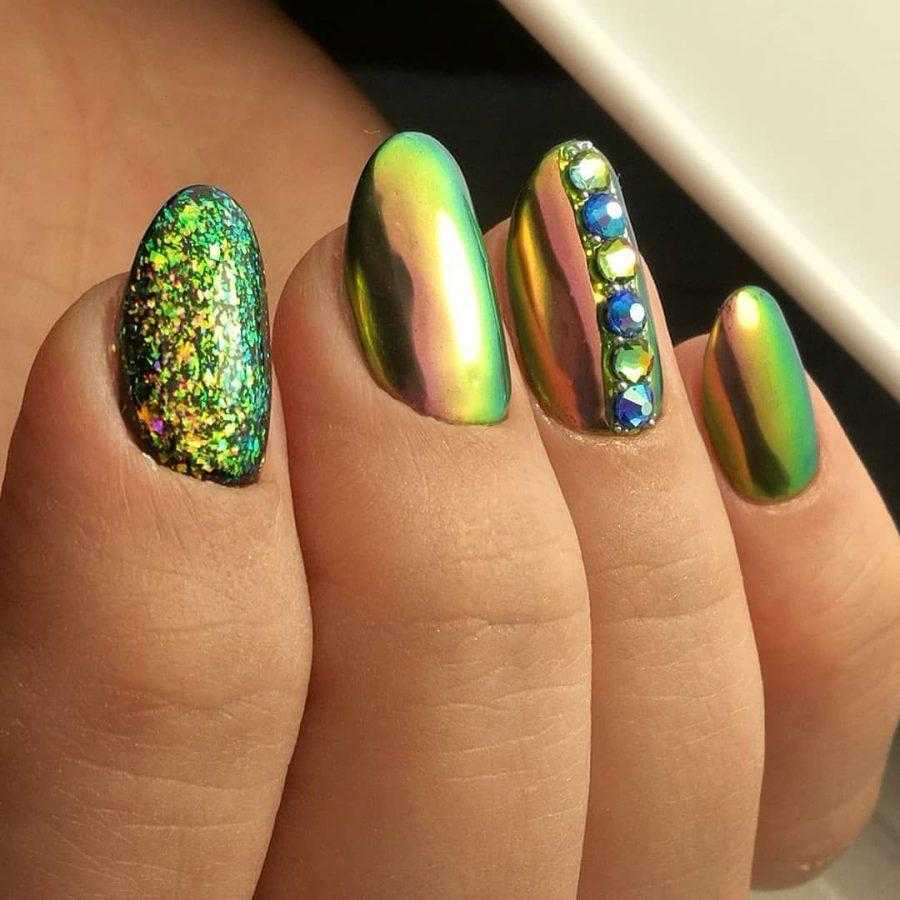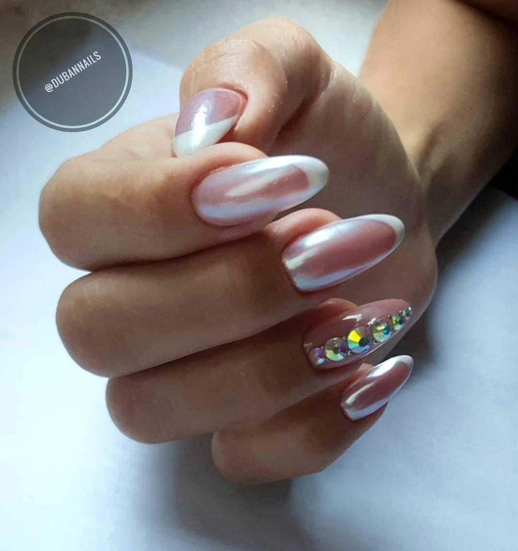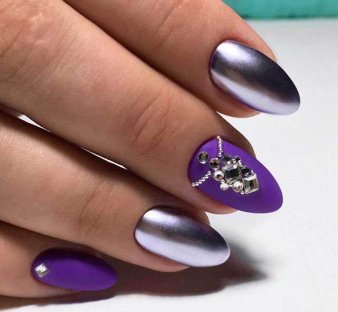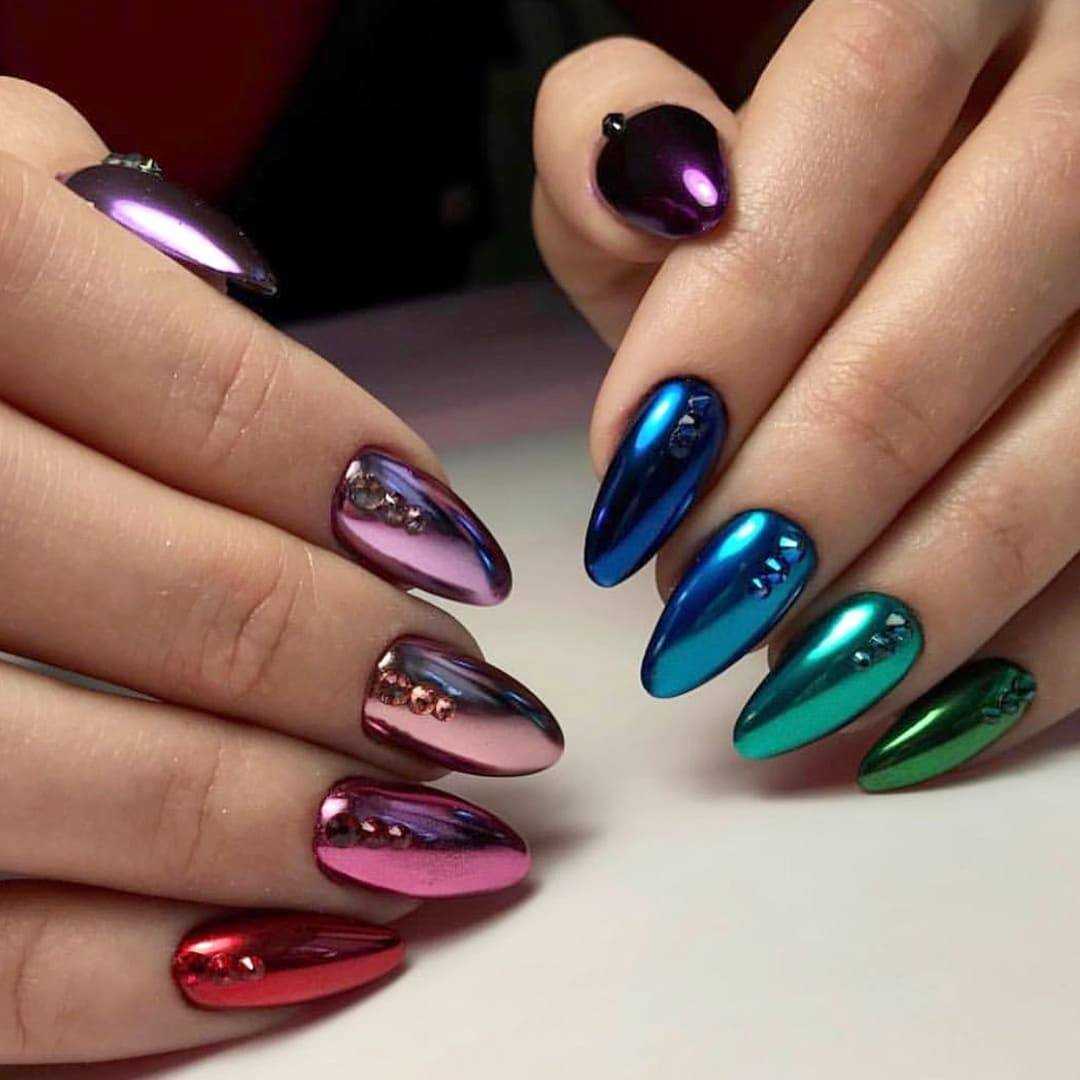 Дизайн ногтей из втирки всех оттенков отлично сочетается со стразами, на переливающихся ноготках блеск кристаллов выглядит экзотично и эффектно.