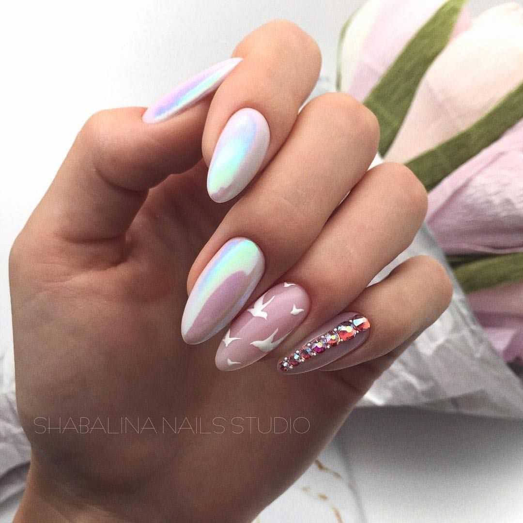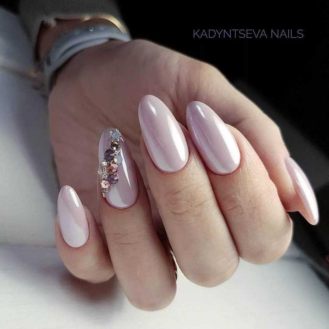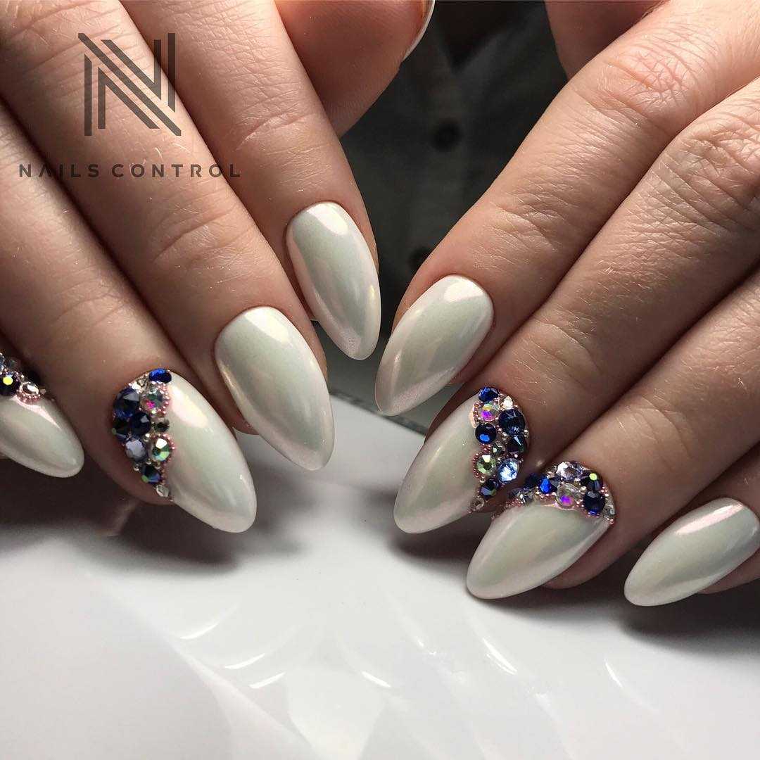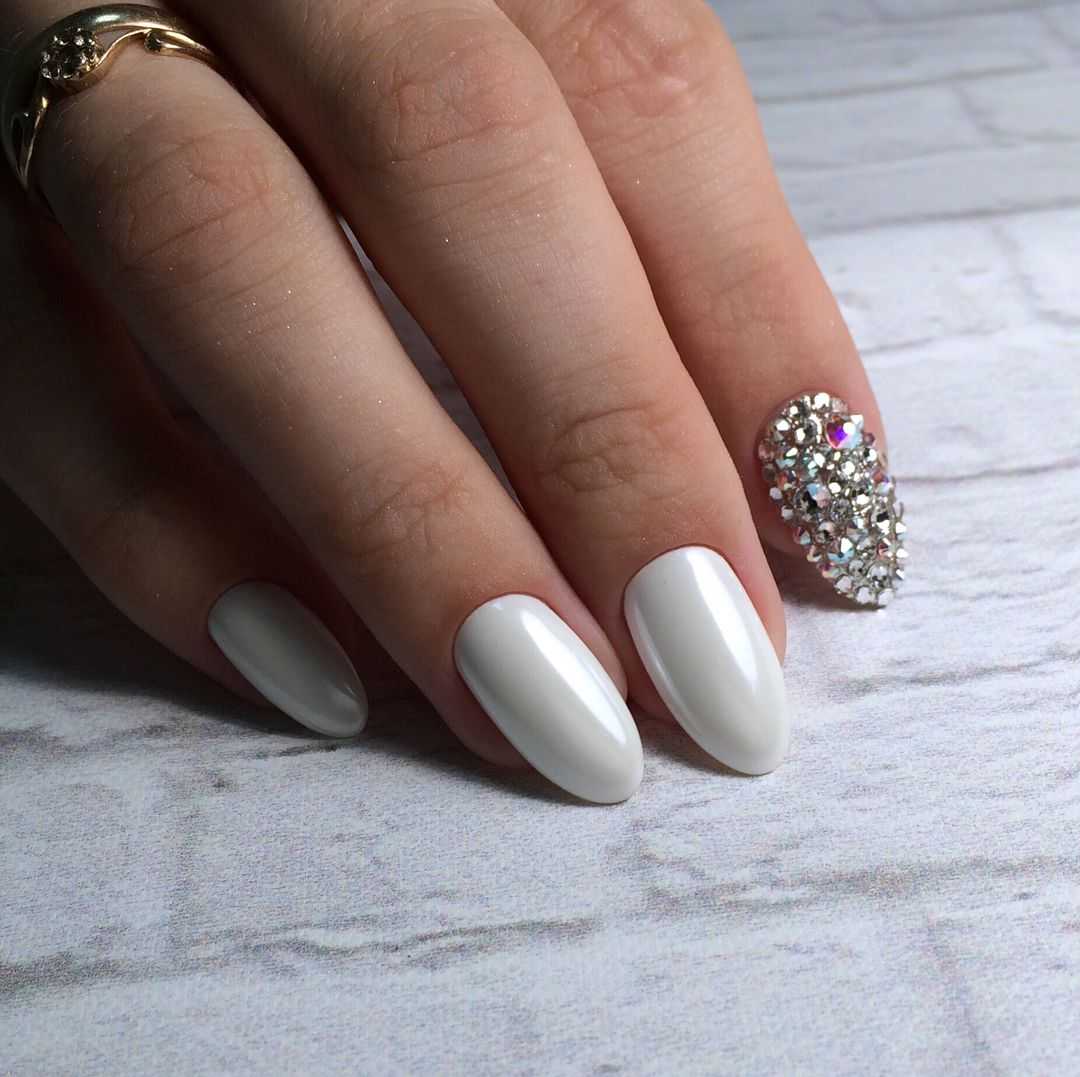 Дизайн ногтей из втирки всех оттенков отлично сочетается со стразами, на переливающихся ноготках блеск кристаллов выглядит экзотично и эффектно.