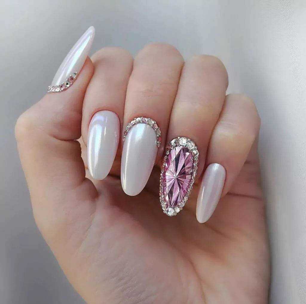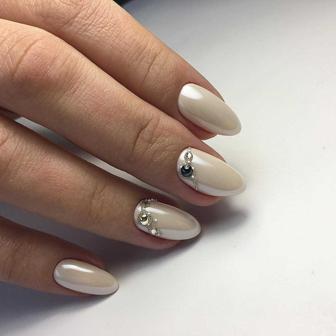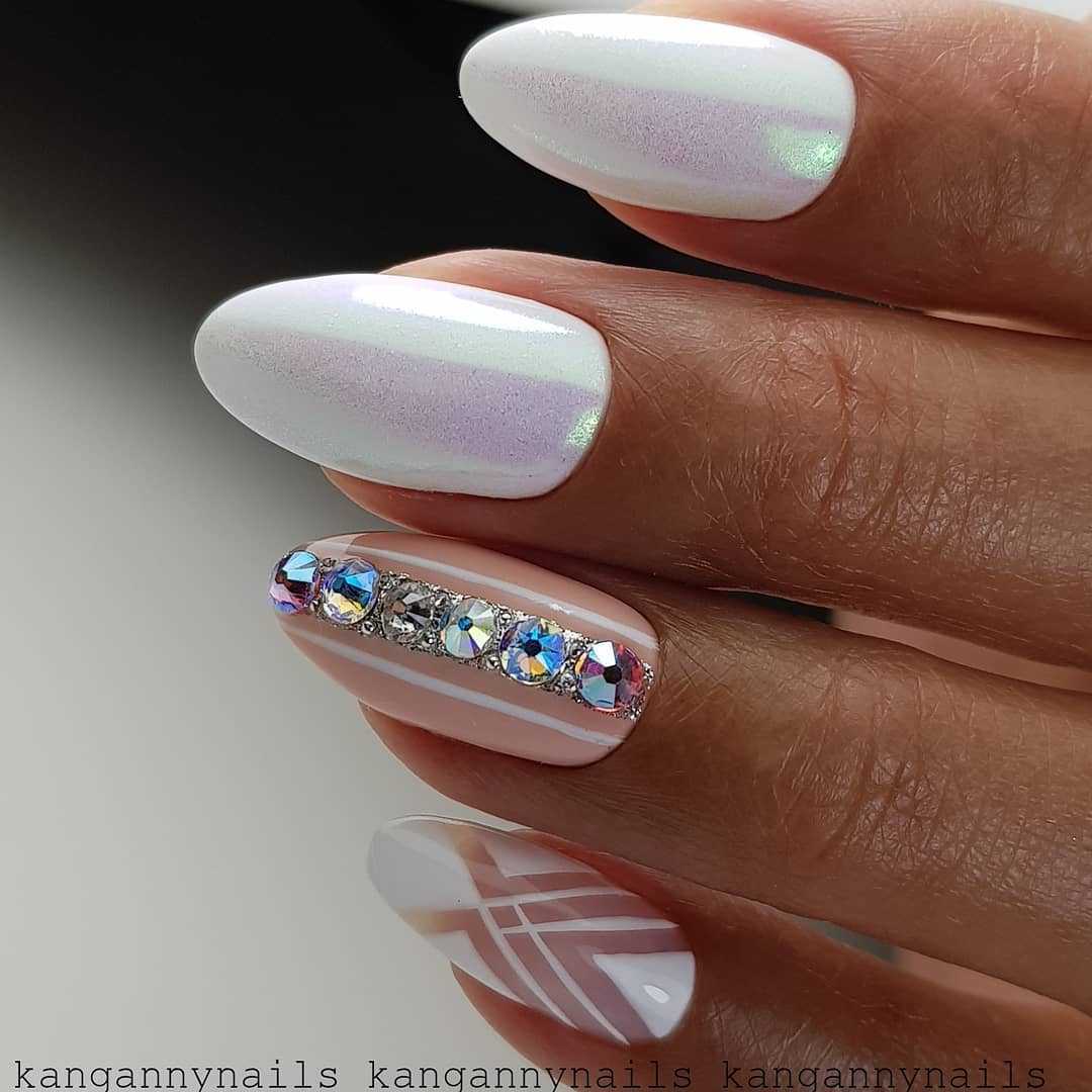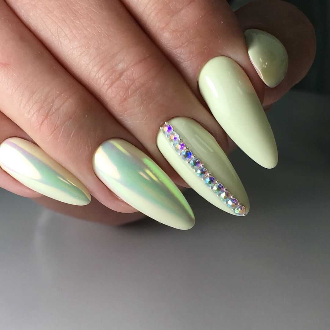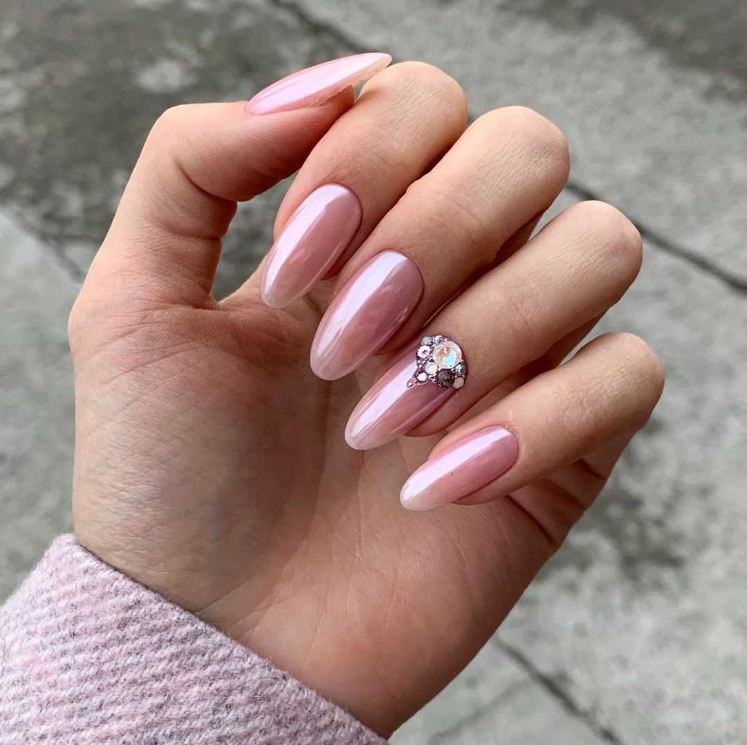 Дизайн ногтей из втирки всех оттенков отлично сочетается со стразами, на переливающихся ноготках блеск кристаллов выглядит экзотично и эффектно.