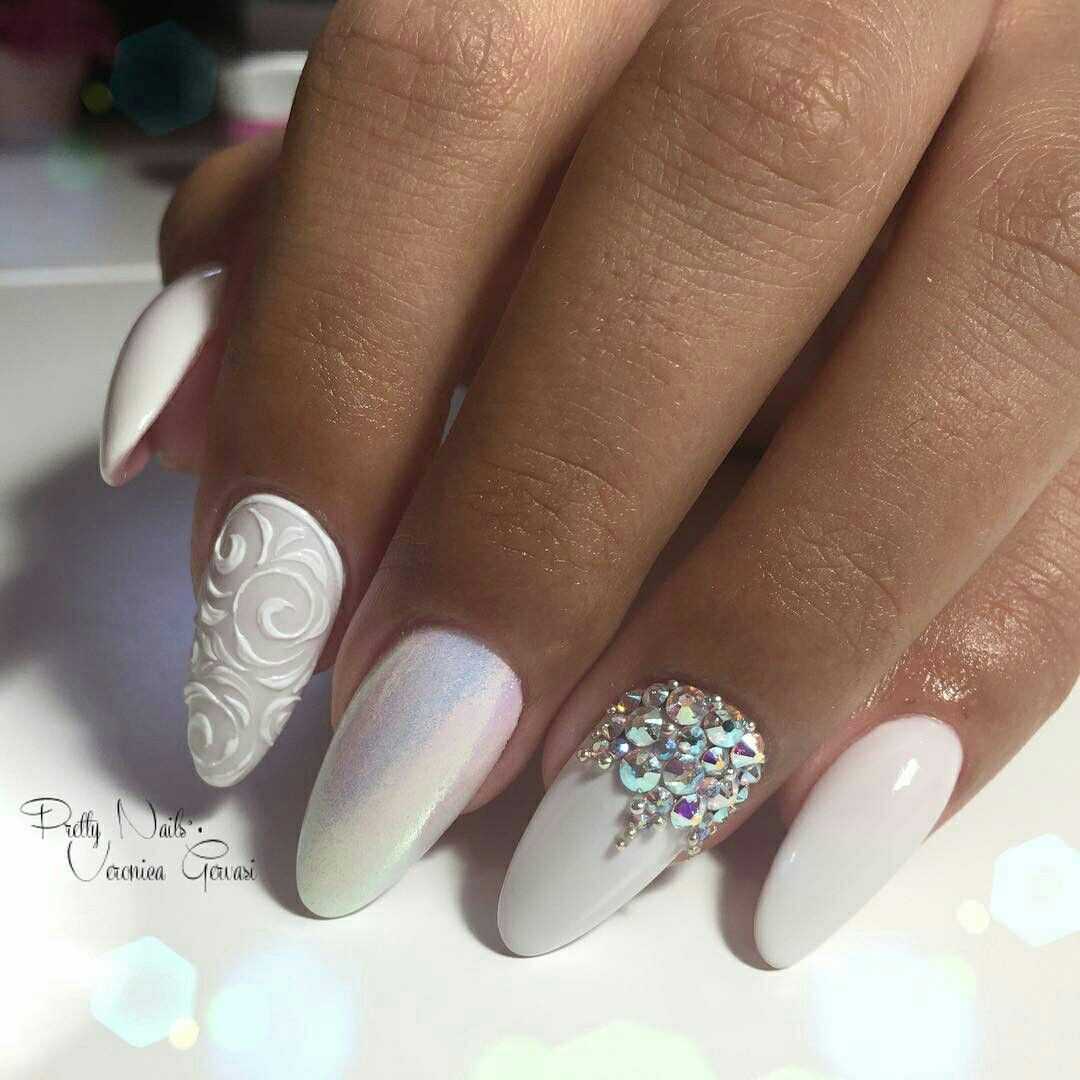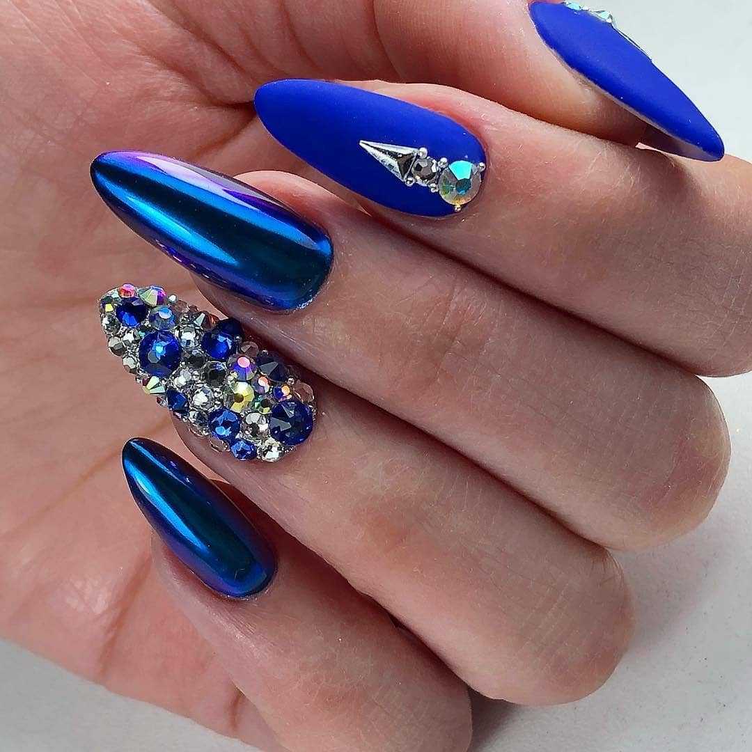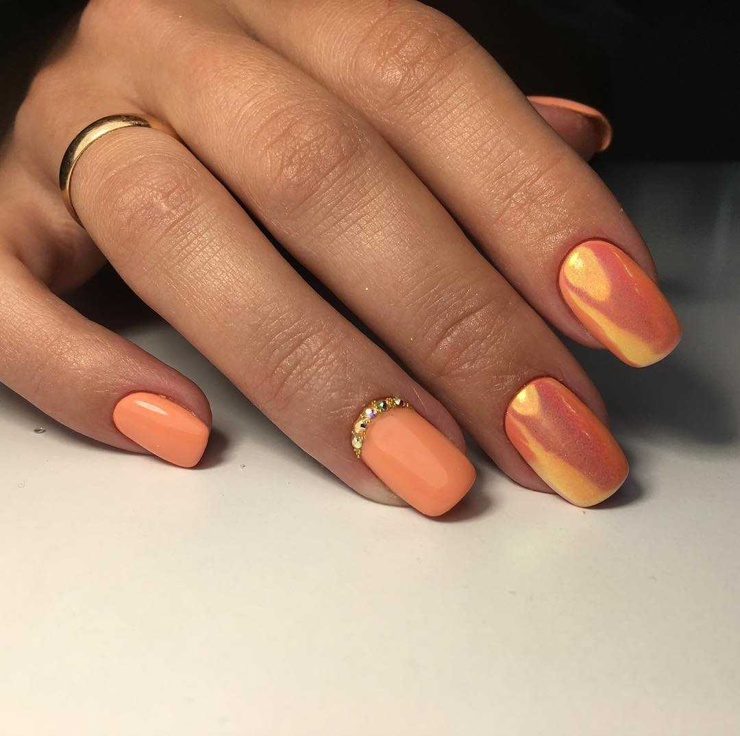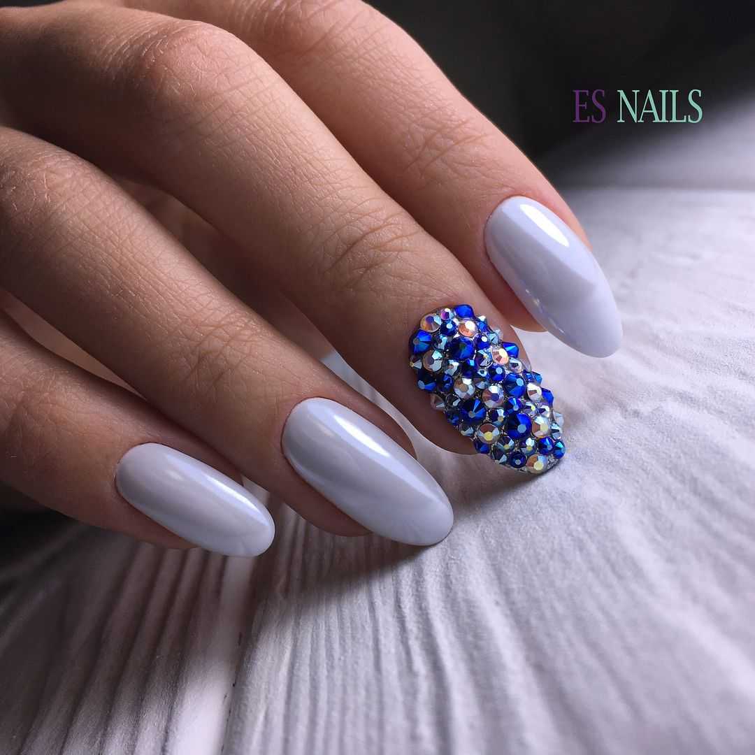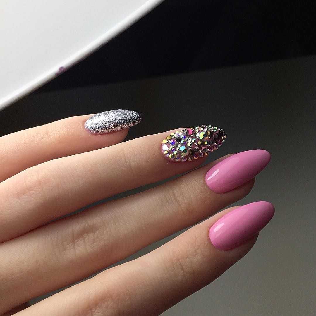 Дизайн ногтей из втирки всех оттенков отлично сочетается со стразами, на переливающихся ноготках блеск кристаллов выглядит экзотично и эффектно.