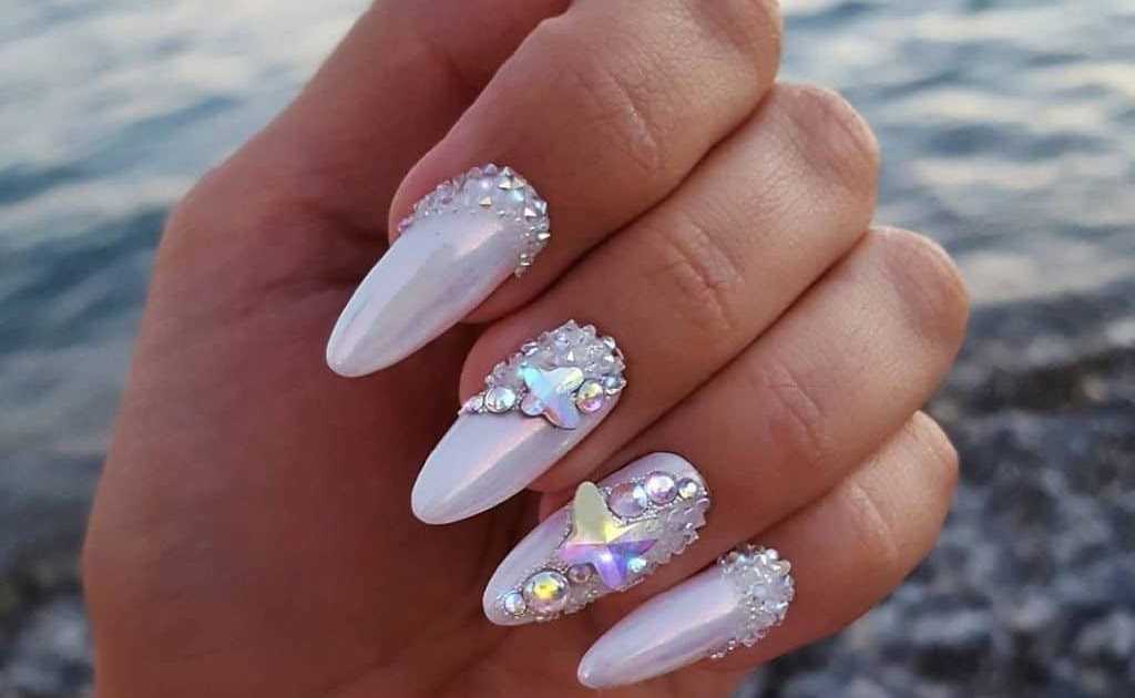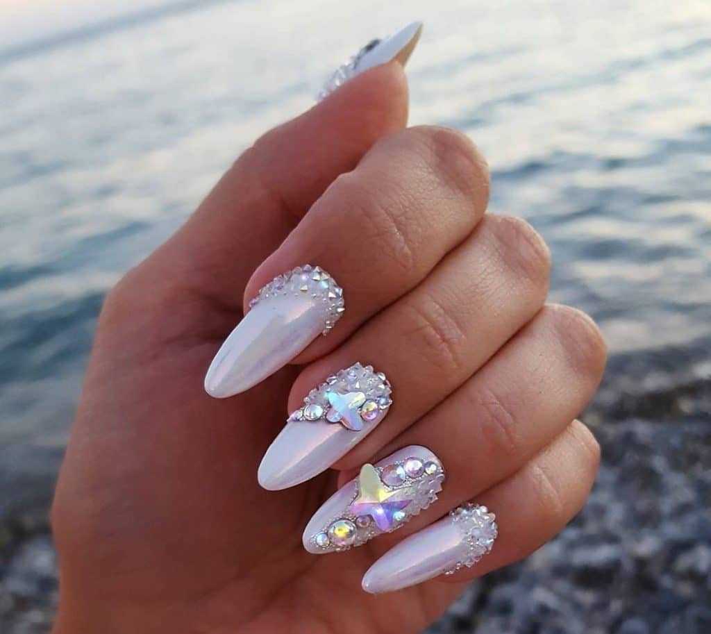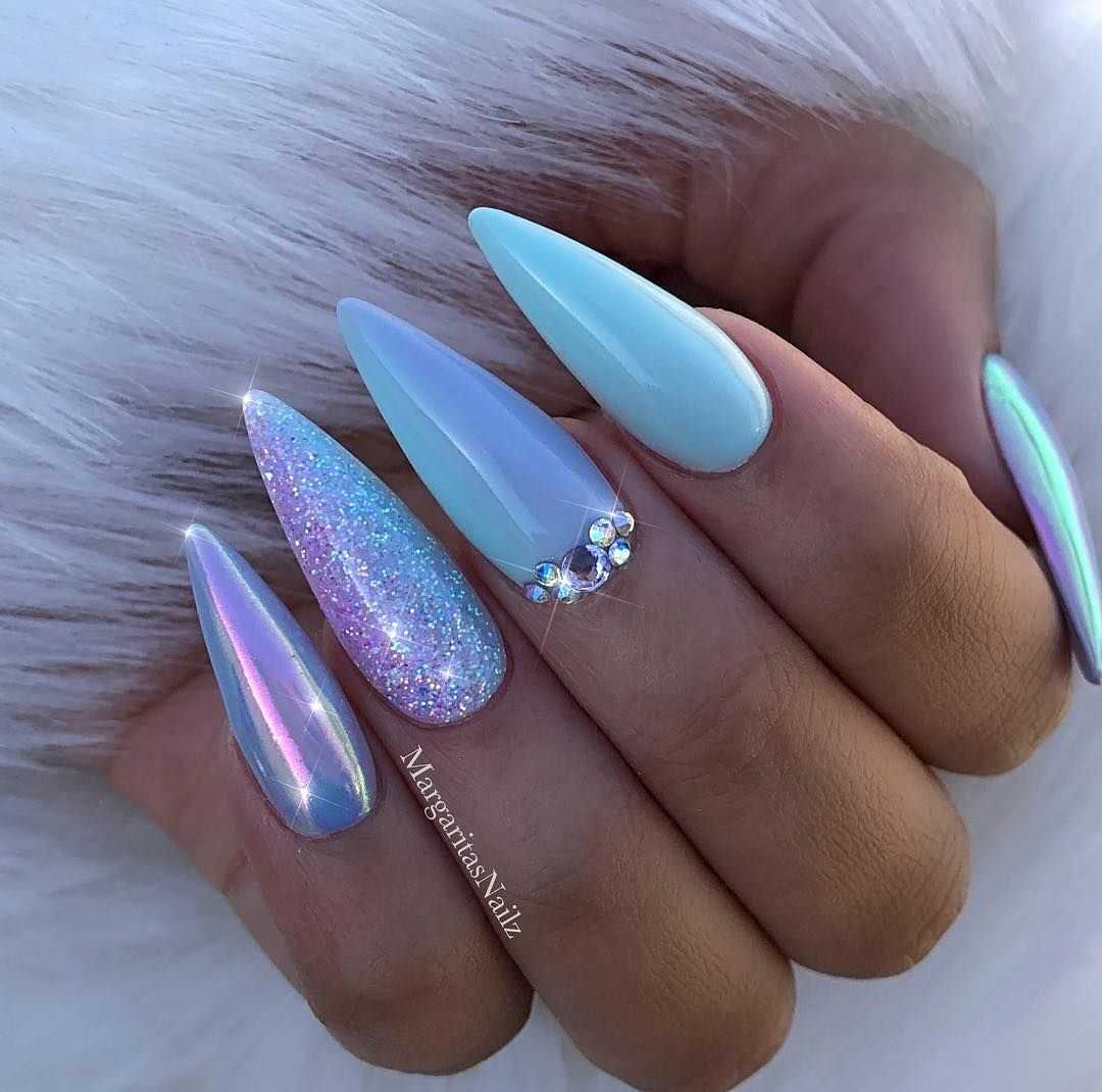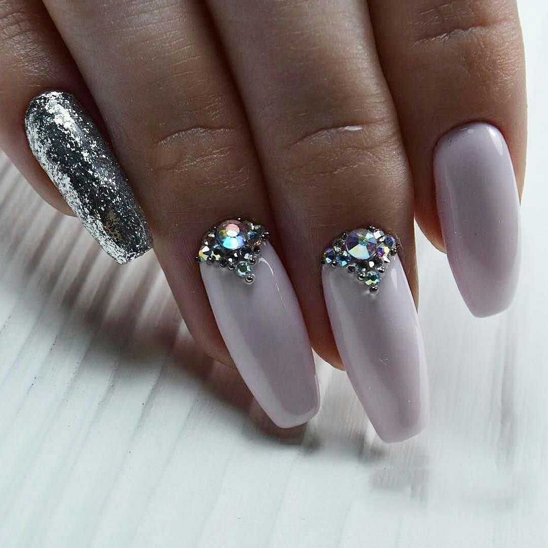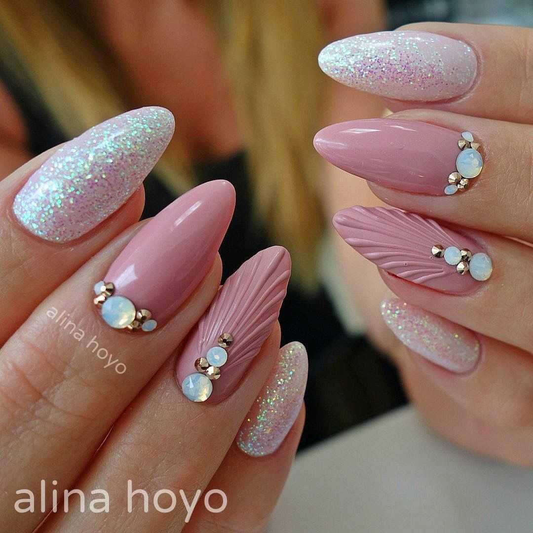 Длинные ногти – это настоящий «холст» для нейл-мастера, на котором можно создать самый замысловатый дизайн. Для него можно использовать разный декор, сочетающийся с блестящими втирками: стразы, бульонки, глиттер, песок, хлопья Юкки, фольгу, роспись.