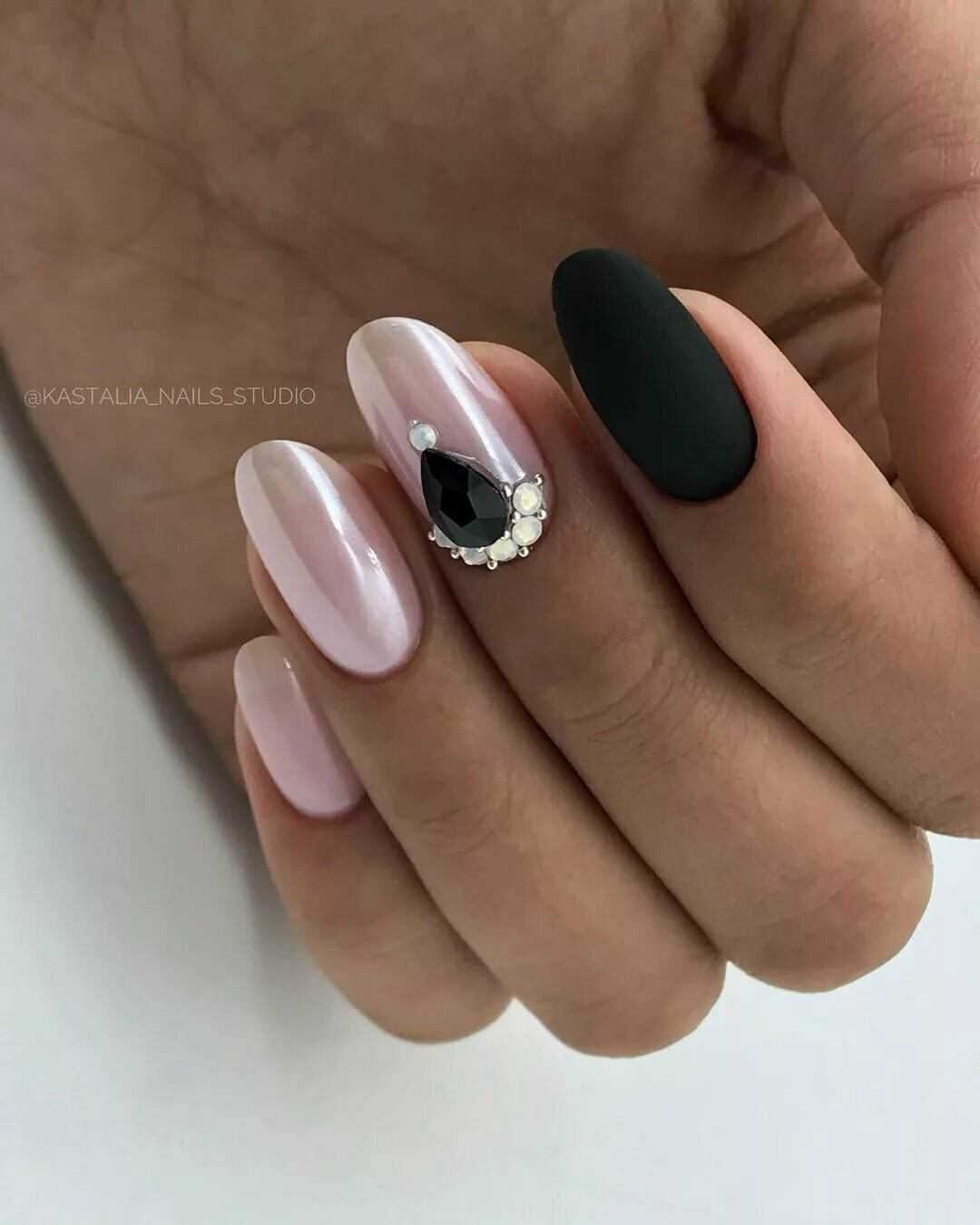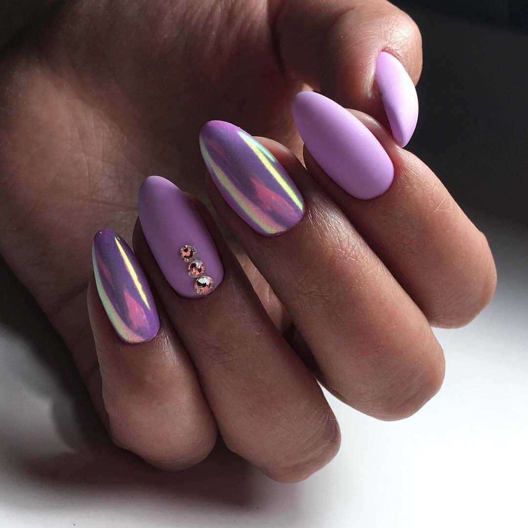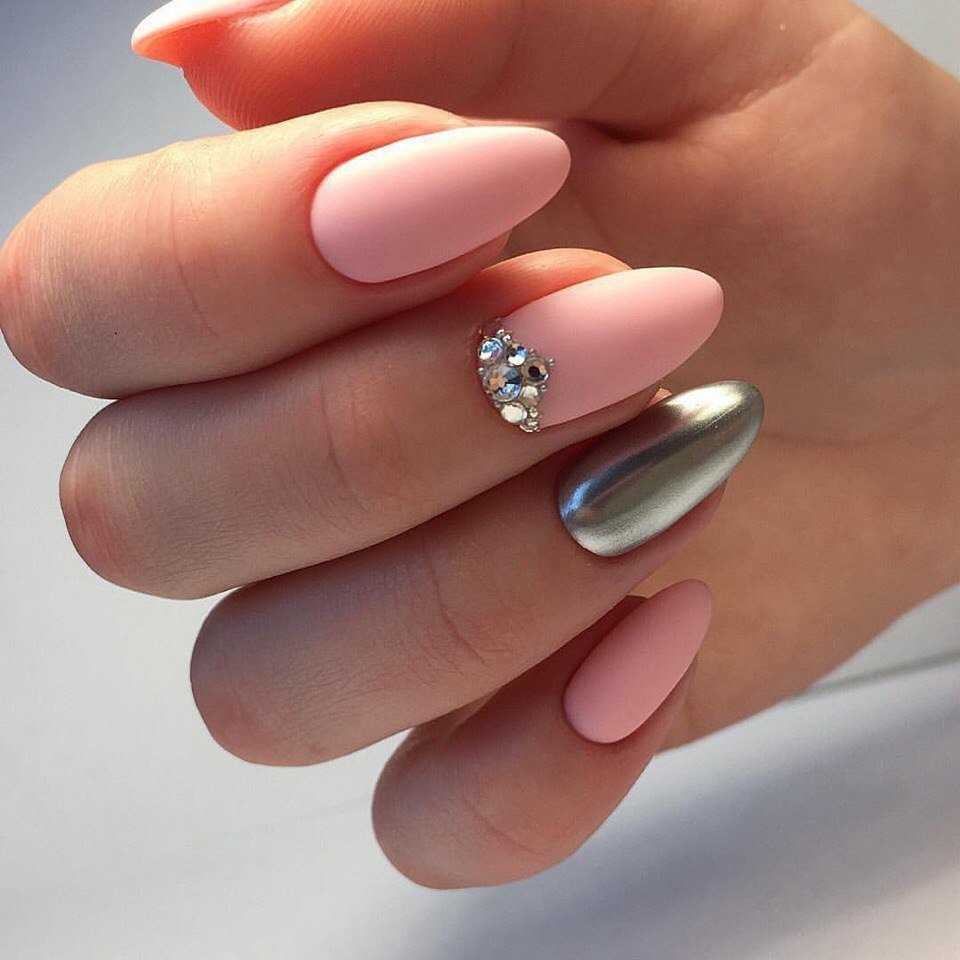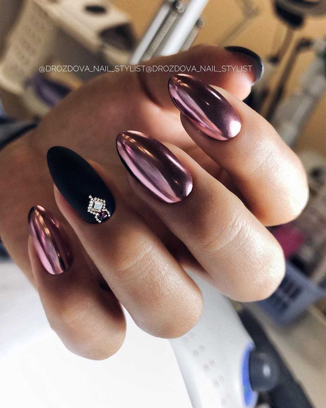 Сочетание матового маникюра с блестящим пигментом — очень красивый вариант. На сдержанном спокойном фоне, зеркальный акцент на одном-двух ноготках, уместен и оригинален.