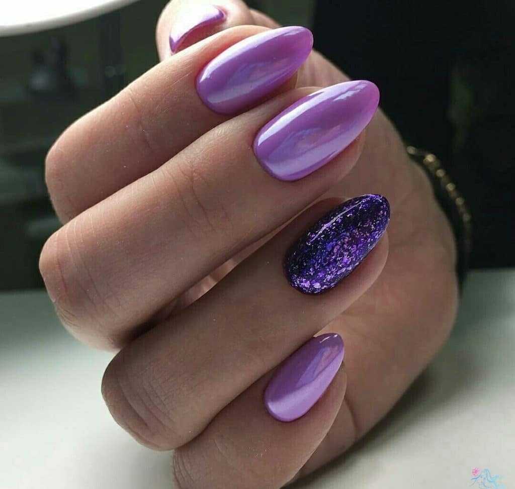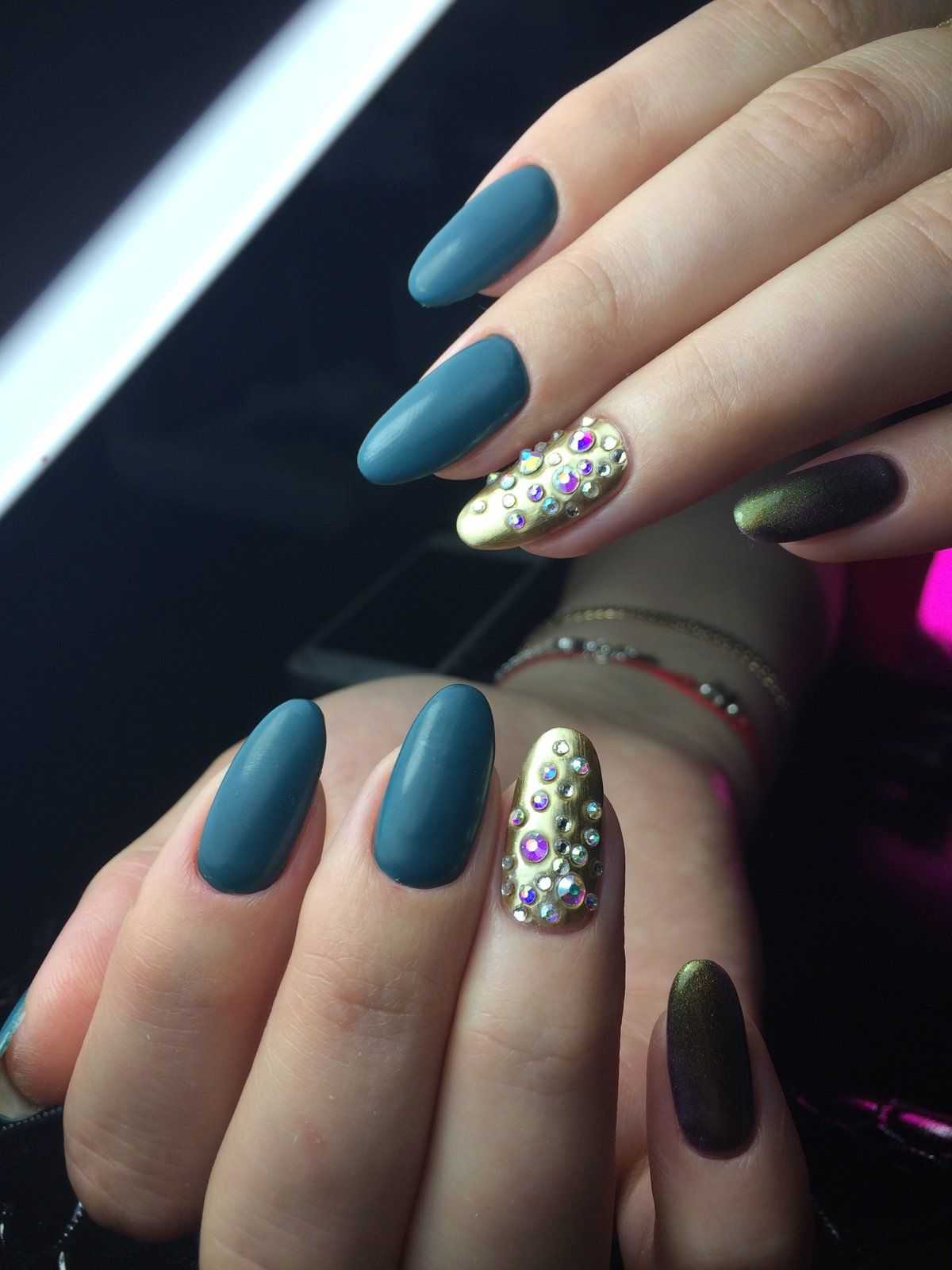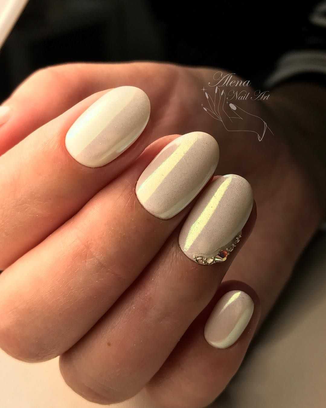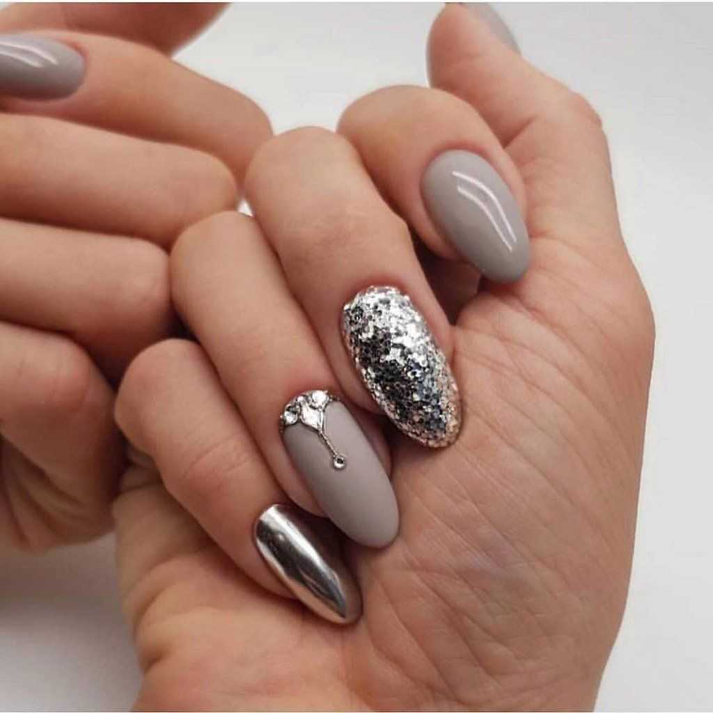 Сочетание матового маникюра с блестящим пигментом — очень красивый вариант. На сдержанном спокойном фоне, зеркальный акцент на одном-двух ноготках, уместен и оригинален.