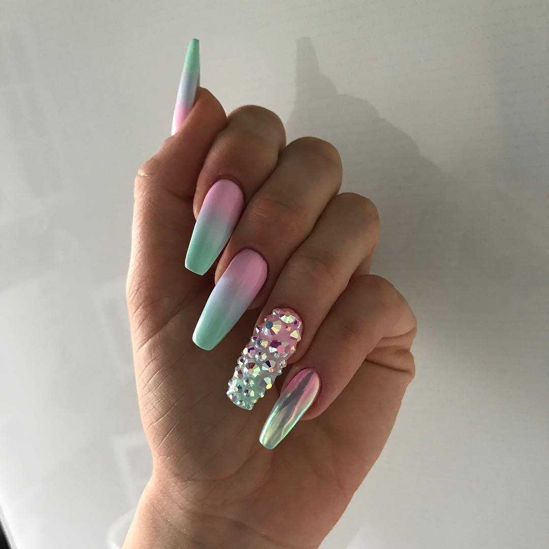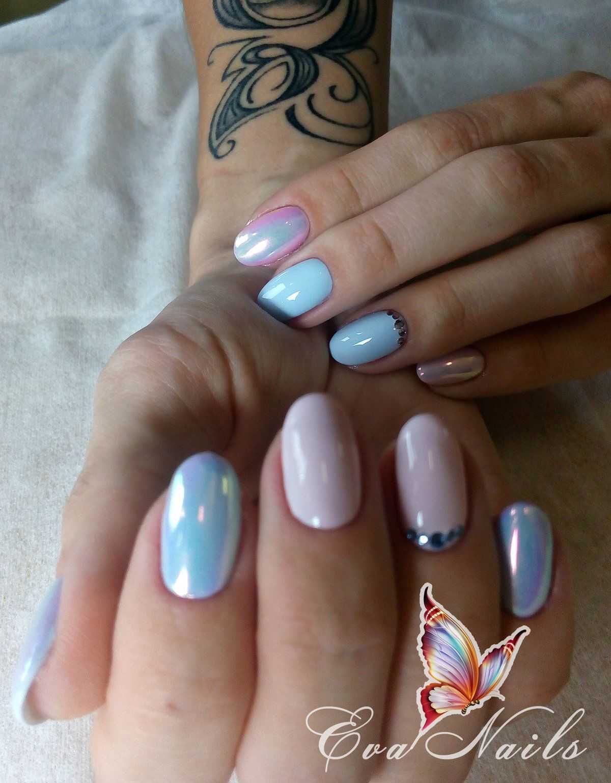Нежные оттенки великолепно смотрятся в сочетании с серебряными, золотыми, разноцветными втирками. Создавайте не только мягкие пастельные нейл-арты, но и выбирайте в качестве основного фона розовый, нежно-голубой, сиреневый, мягкий желтый и другие яркие тона. Они также смотрятся на ногтях нежно и сдержанно, позволяют использовать стразы и камни необычной формы и расцветки.