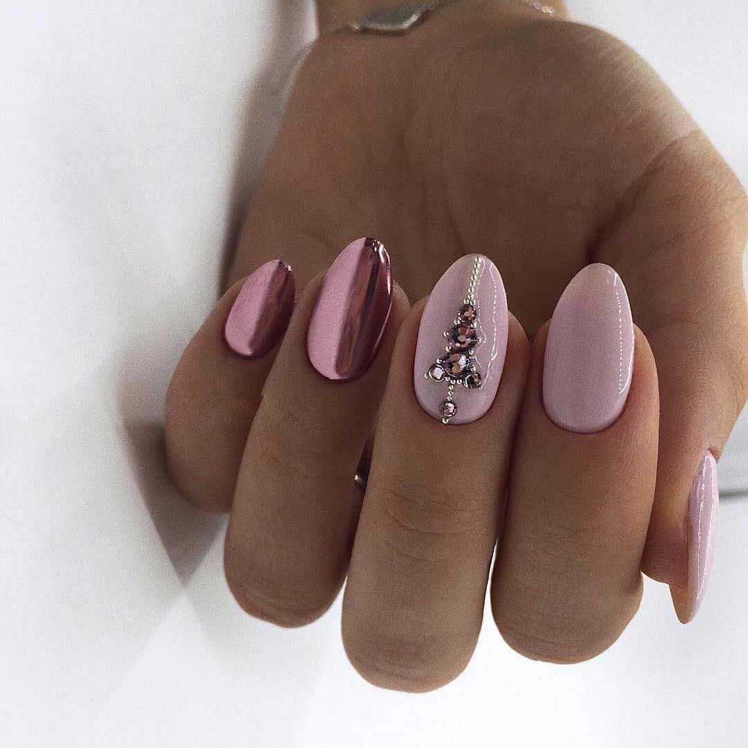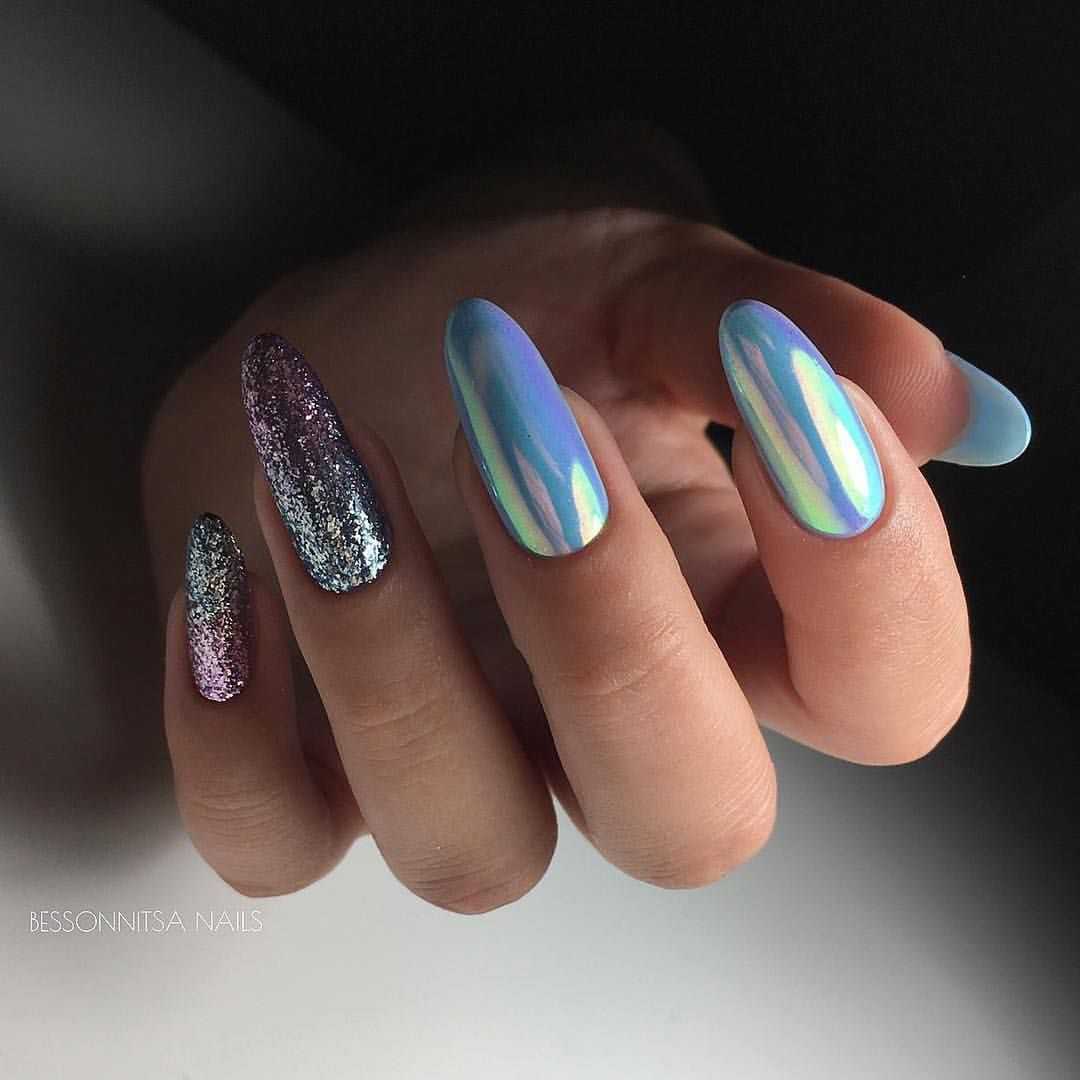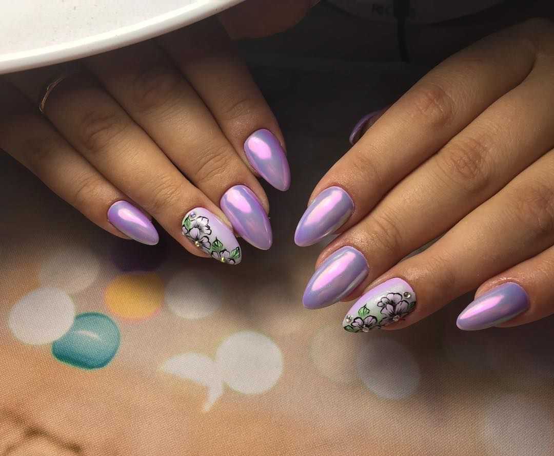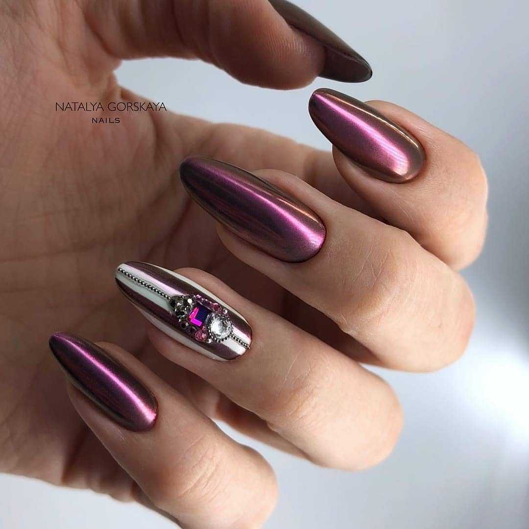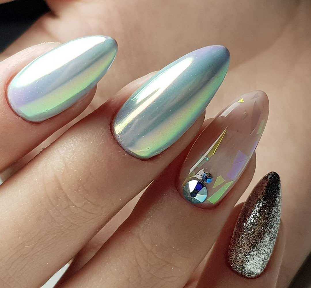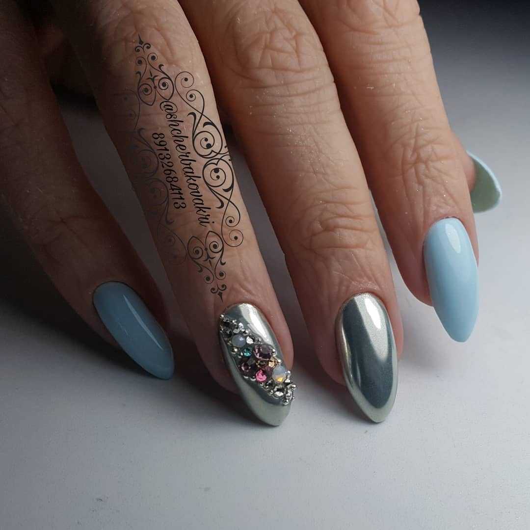 Зеркальный маникюр 2020 не ограничивается одним лишь покрытием. Часто его дополняют тем или иным декором, рисунком, перекрывают матовым топом.
