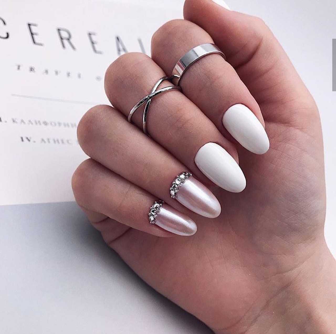 Стандартные белый, серый, бежевый, персиковый или бледно-розовый оттенки лака в этом случае смотрятся с блестящим пигментом просто потрясающе. Если подобной идеи вам кажется недостаточно и остаётся ощущение, что в маникюре чего-то не хватает, можно украсить маникюр рисунком или создать комбинированный дизайн, в котором френч сочетается с однотонными ногтями, покрытыми голографическими переливами или металлическим сиянием.