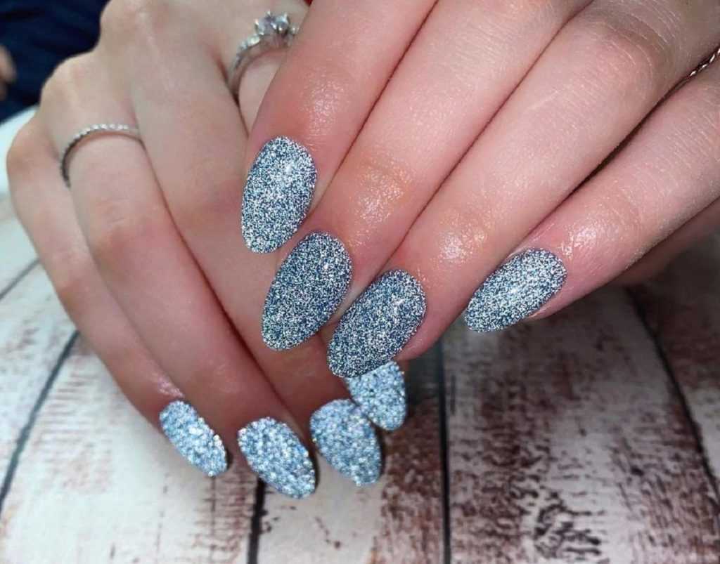 Рассыпчатые блестки могут иметь разный размер частиц и способ нанесения. Чаще всего блестками присыпают ноготок, покрытый гель-лаком, после чего покрытие просушивается, и глиттер прочно удерживается на нем.