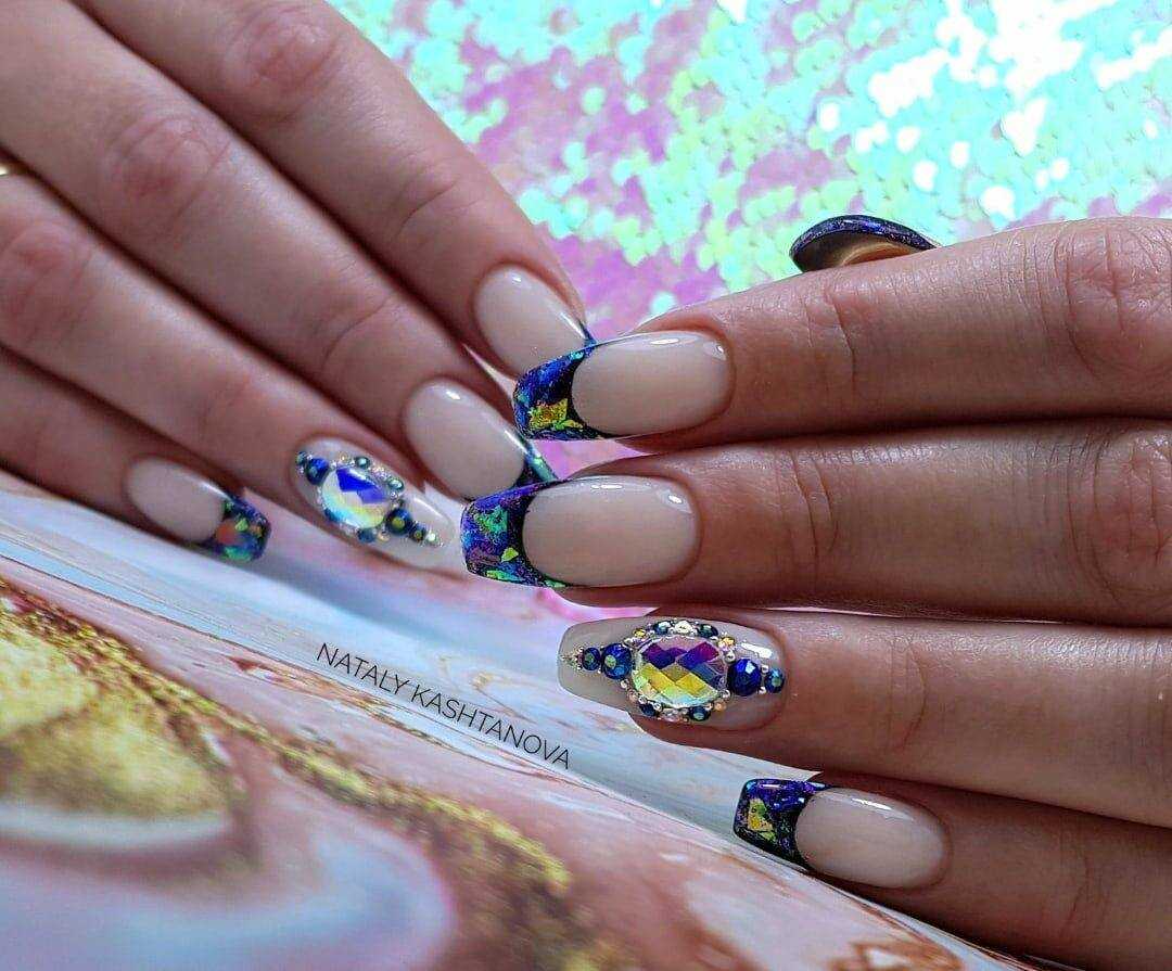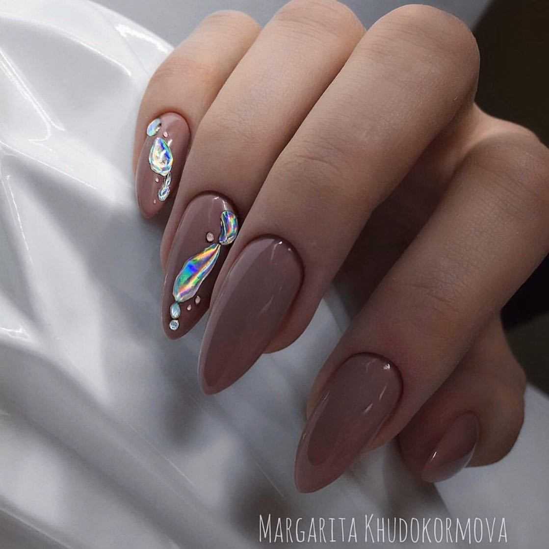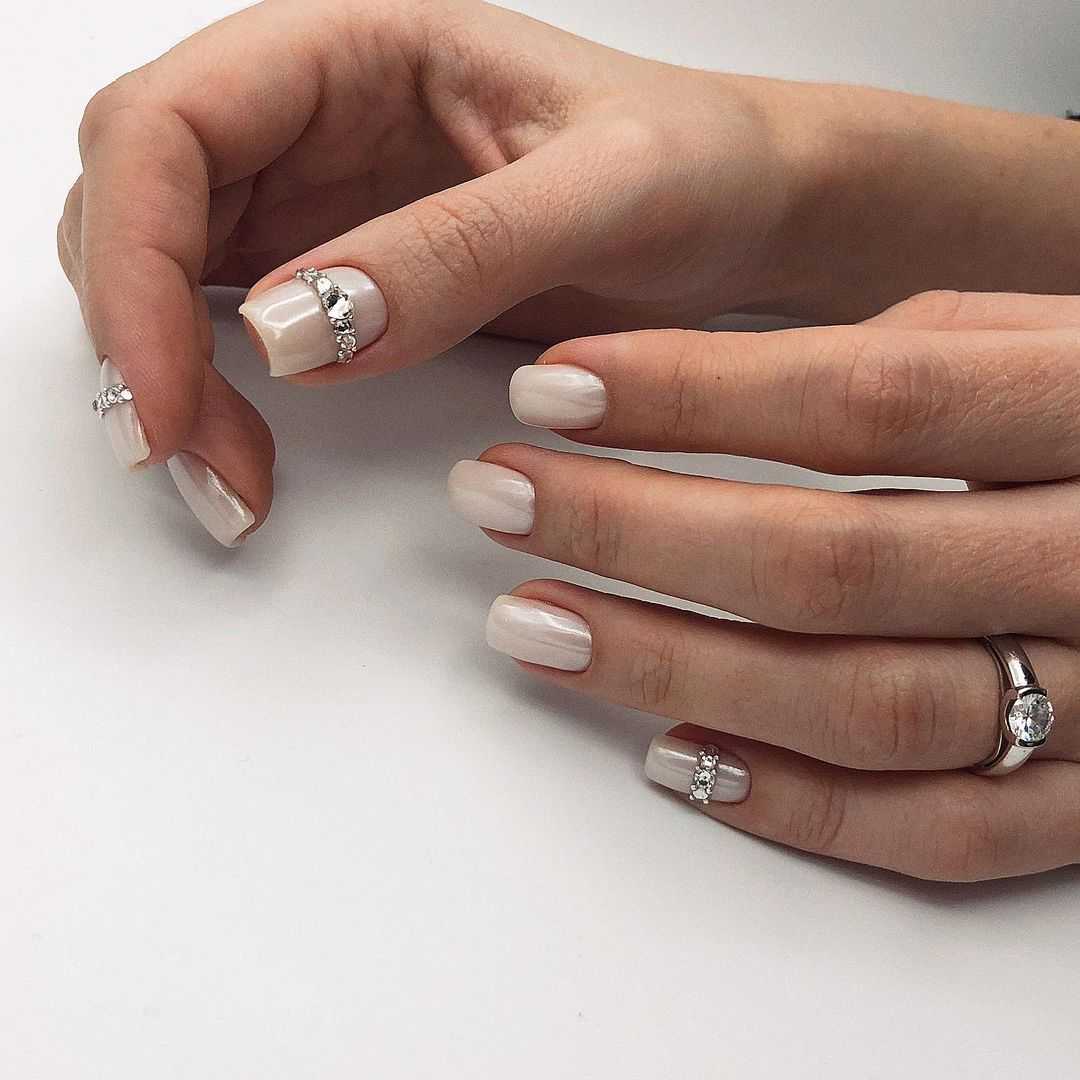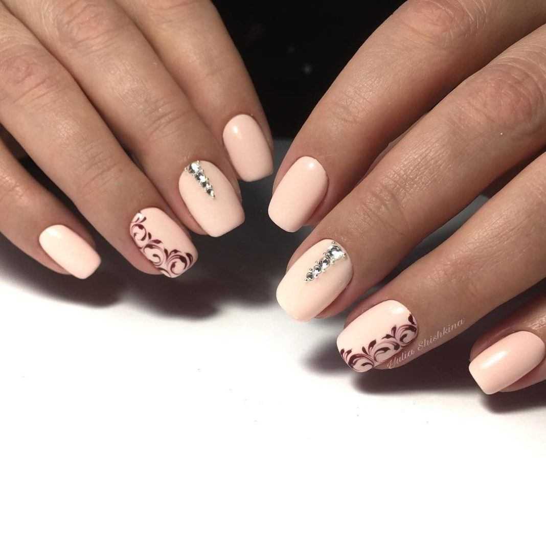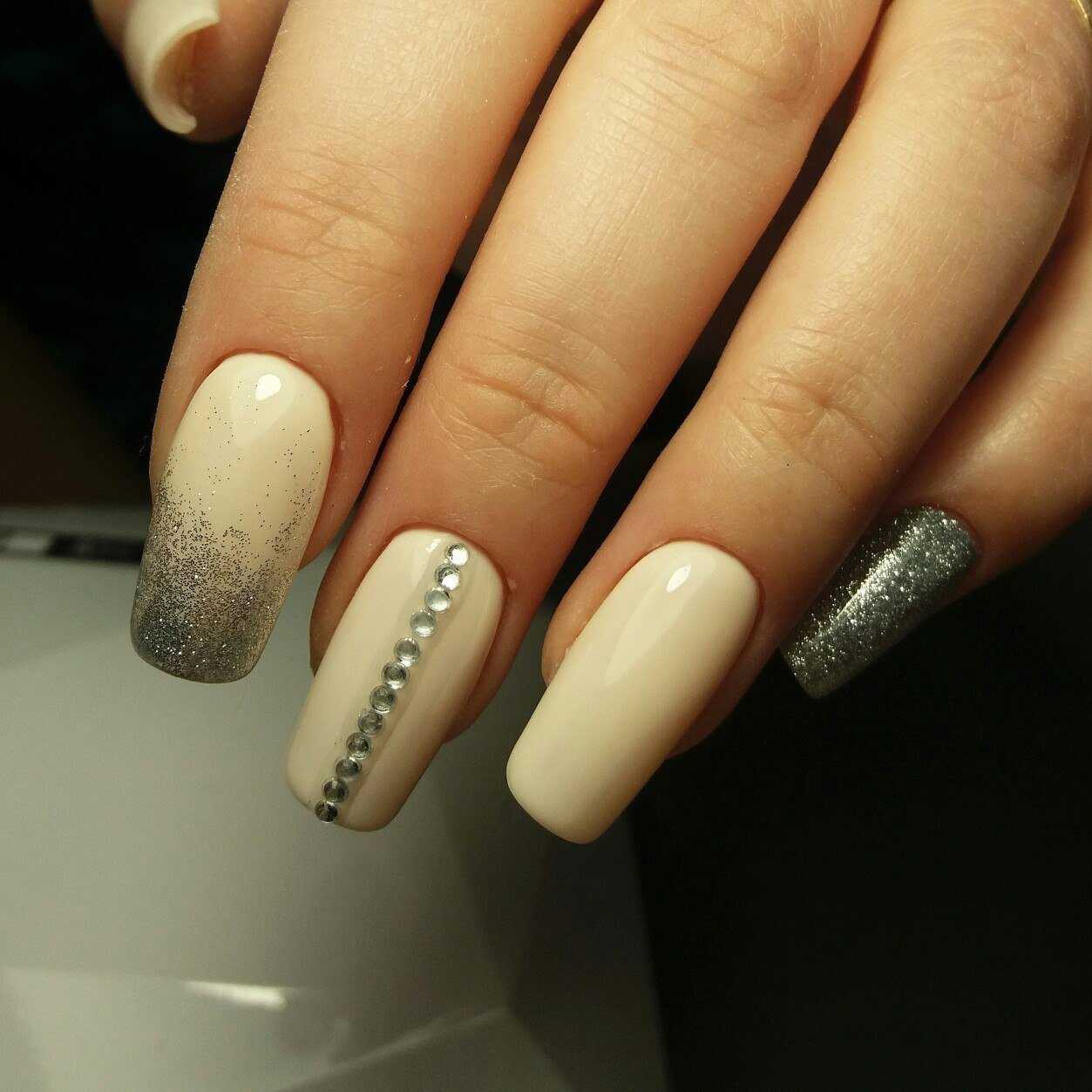 Стильные варианты оформления маникюра беж со стразами и блёстками