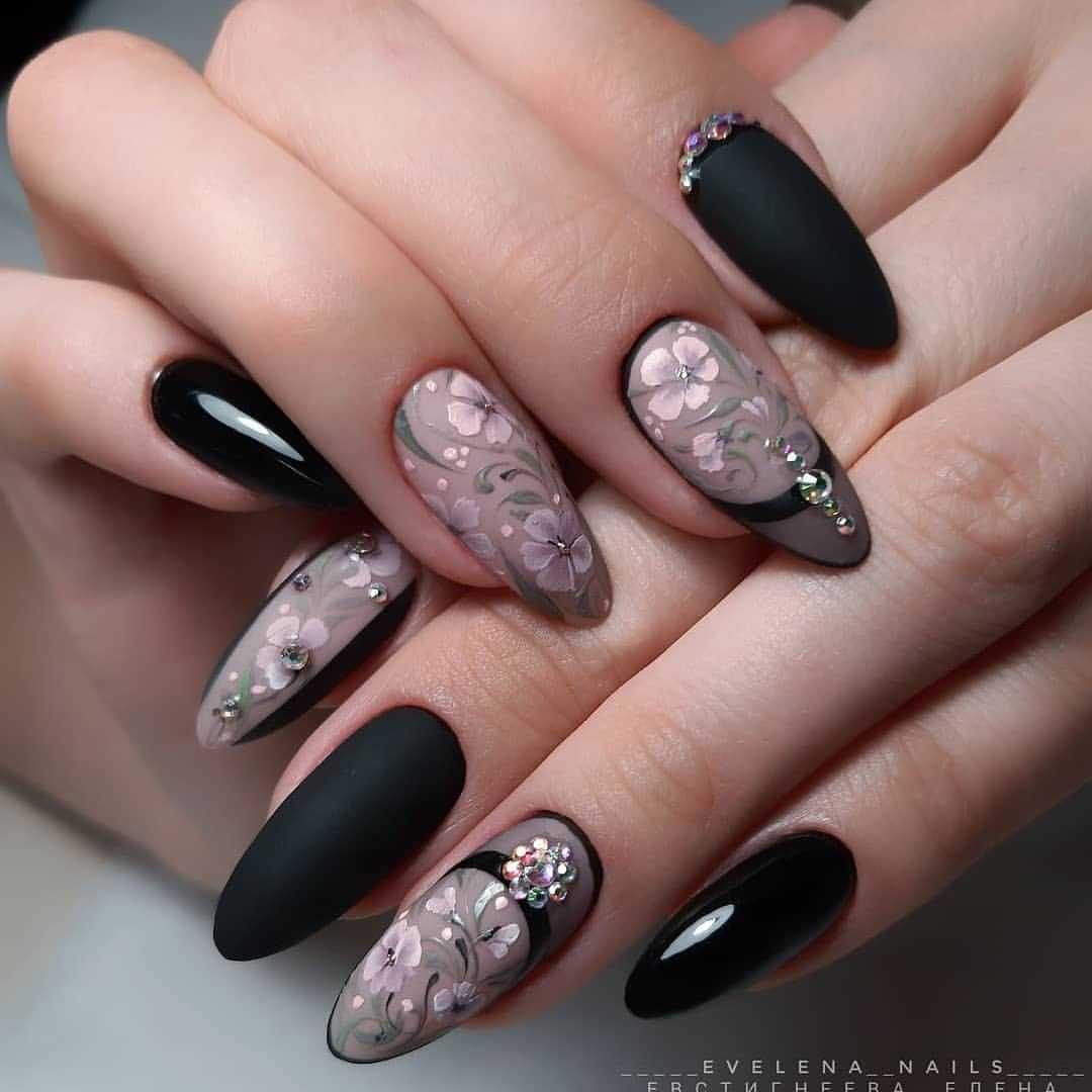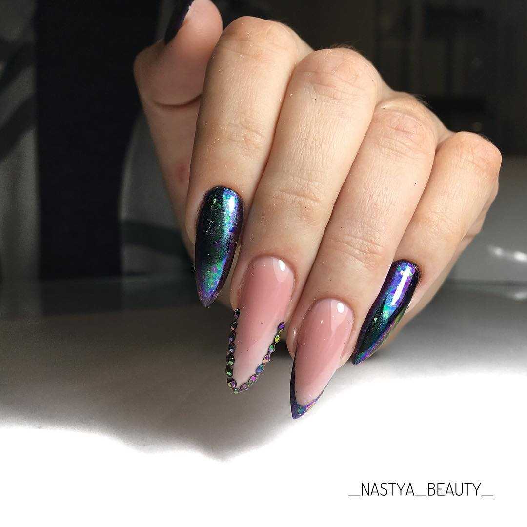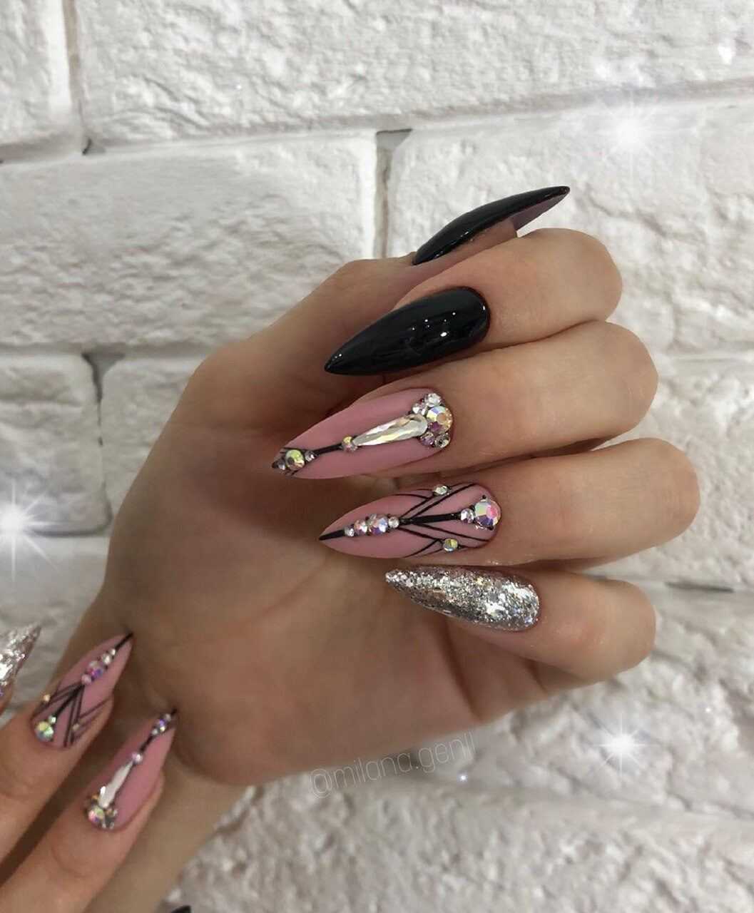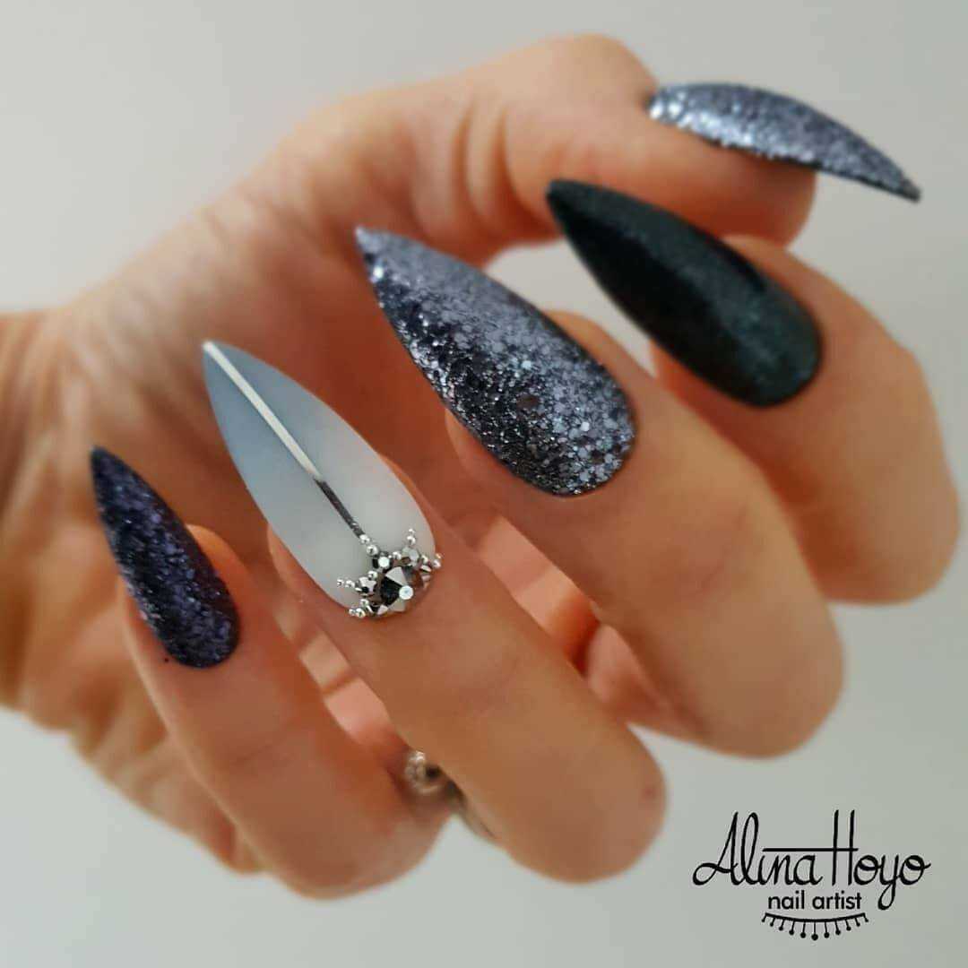 Стильный нейл-дизайн на длинные ногти со стразами в чёрных тонах