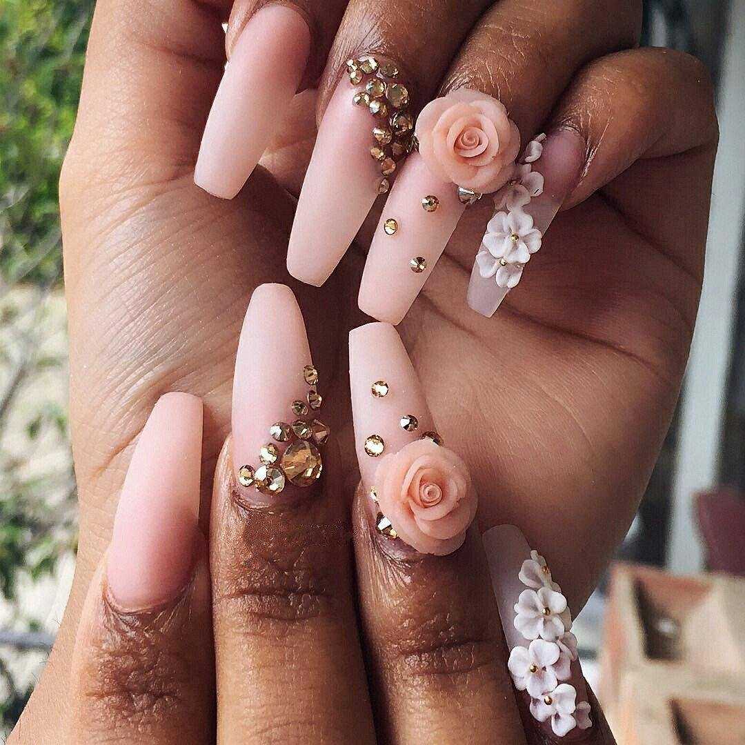Небольшие бутоны всегда смотрятся лаконично, поэтому их выбирают чаще всего. Популярностью также пользуются крупные, объемные цветы. К примеру, маки в сочетании с красным покрытием смотрятся невероятно красиво. В свою очередь, стразы разной формы лишь дополнят маникюр.