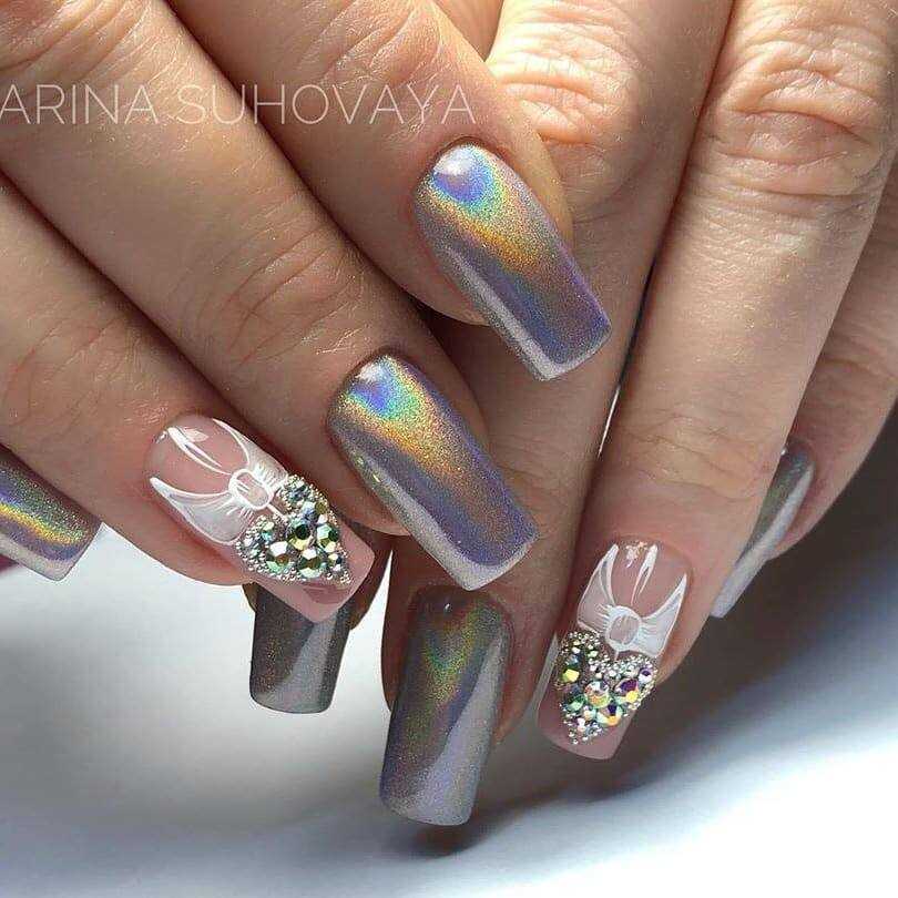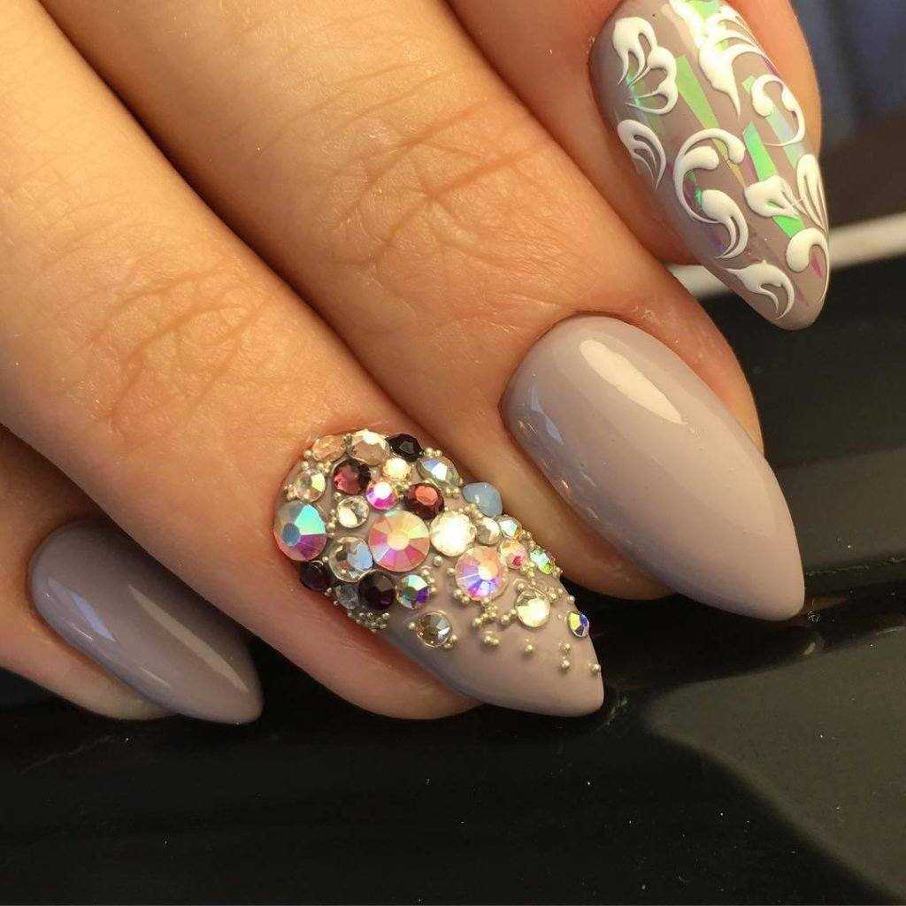Стразы и блёстки – наиболее популярный декор в нейл-индустрии. Поэтому, вариации маникюра, выполненные с различными вариациями тандемного сочетания стразов и блёсток, всегда занимают топовые позиции. Это может проявляться на одной руке в виде рамок, выполненных глиттером или узоров из стразов, которые чередуются между собой, вариаций прорисовки рисунков блестящими штрихами с дополнением в виде жемчуга, бусин, и многих других идеи. При этом стразы и блёстки могут иметь разную форму, размеры и окрас. Все возможные вариации дизайна в этом случае перечислить просто невозможно.