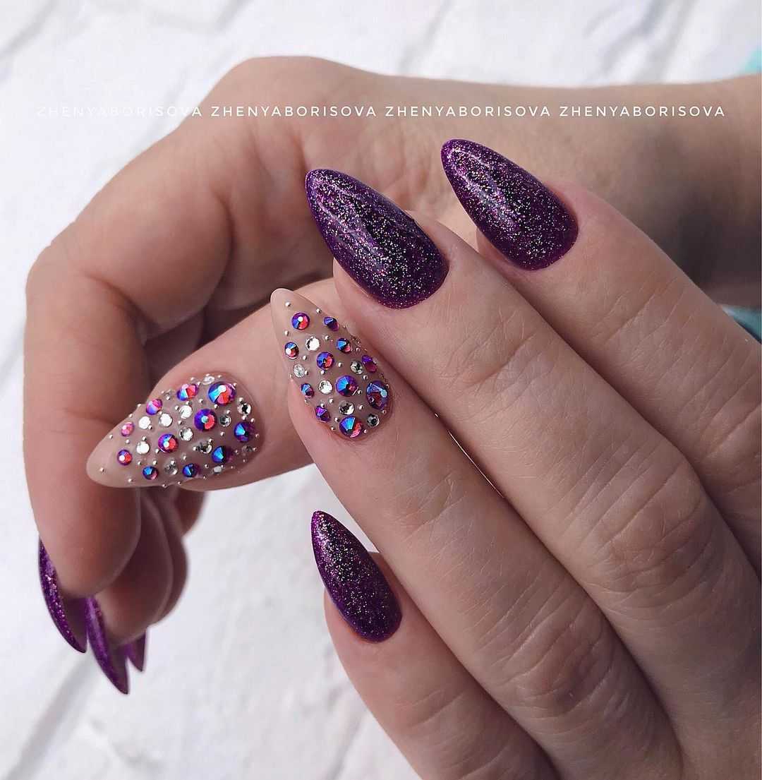 Сочетание в одном маникюре таких потрясающих элементов декорирования, как стразы и блёстки, считается одним из самых удачных и распространённых решений в нейл-индустрии. Эти материалы просто созданы друг для друга и предоставляют модницам массу возможностей преобразить и украсить свои ноготки. Среди актуальных идей выделение ногтевой пластины безымянного пальца бордовыми блёстками и мелкими камушками, шикарные цветочные рисунки с декором, а также узоры у основания ноготков, композиции из полос и многие другие предложения. Блестки и стразы в этом случае могут быть классические – с отливом золота или серебра. А могут дублировать по цвету основной оттенок или контрастно отличаться. Попробуйте выполнить на паре ноготков растяжку чёрными или сиреневыми блёстками и украсить основание аналогичными по цвету бусинами либо камнями. Это невероятно красиво.