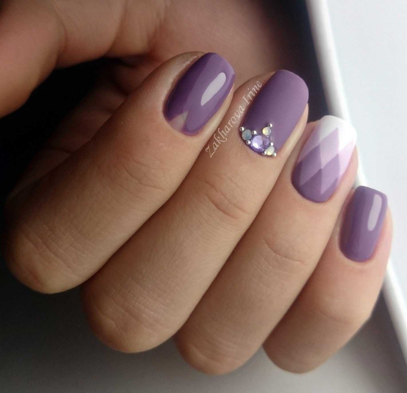 Самым удачным решением будет выбор двух сиреневых нежных тонов разной насыщенности, что освежит маникюр. При желании декор в цвет матового или глянцевого покрытия может завершать дизайн.