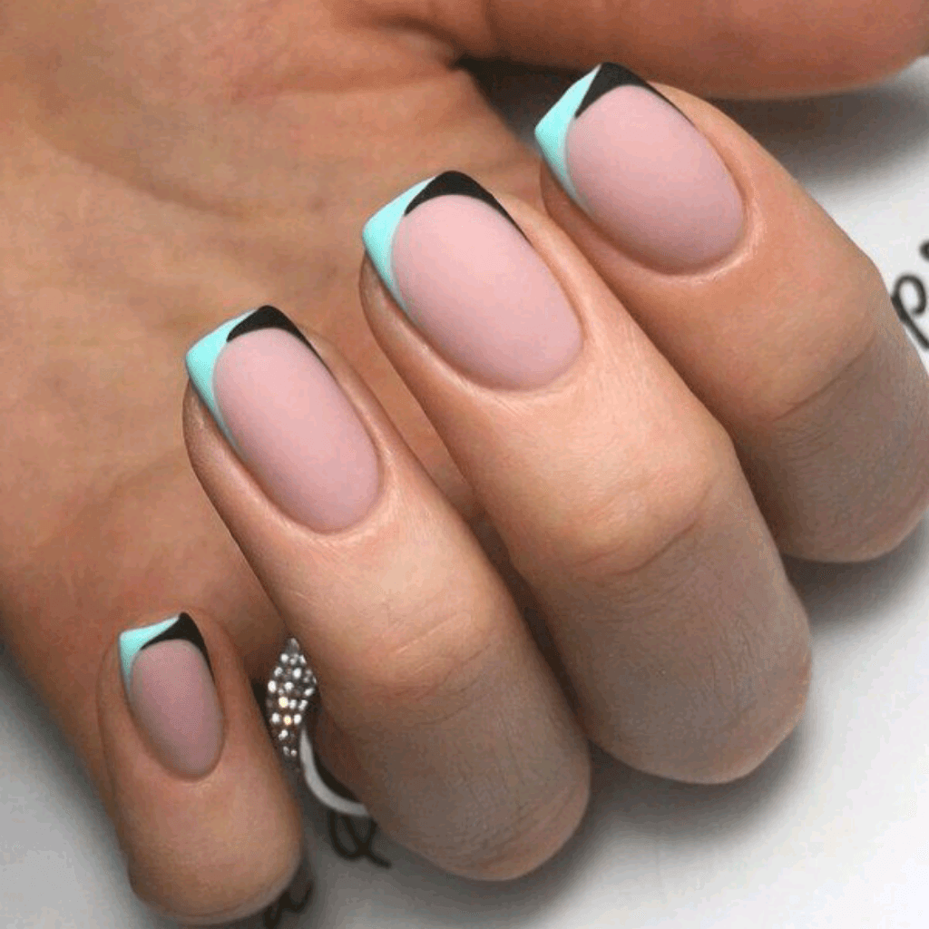 Двойной французский маникюр может быть не только одинарным, но и двойным (и даже больше). Сделать его просто — достаточно разделить зону улыбки на две части и оформит их последовательно в разные цвета.