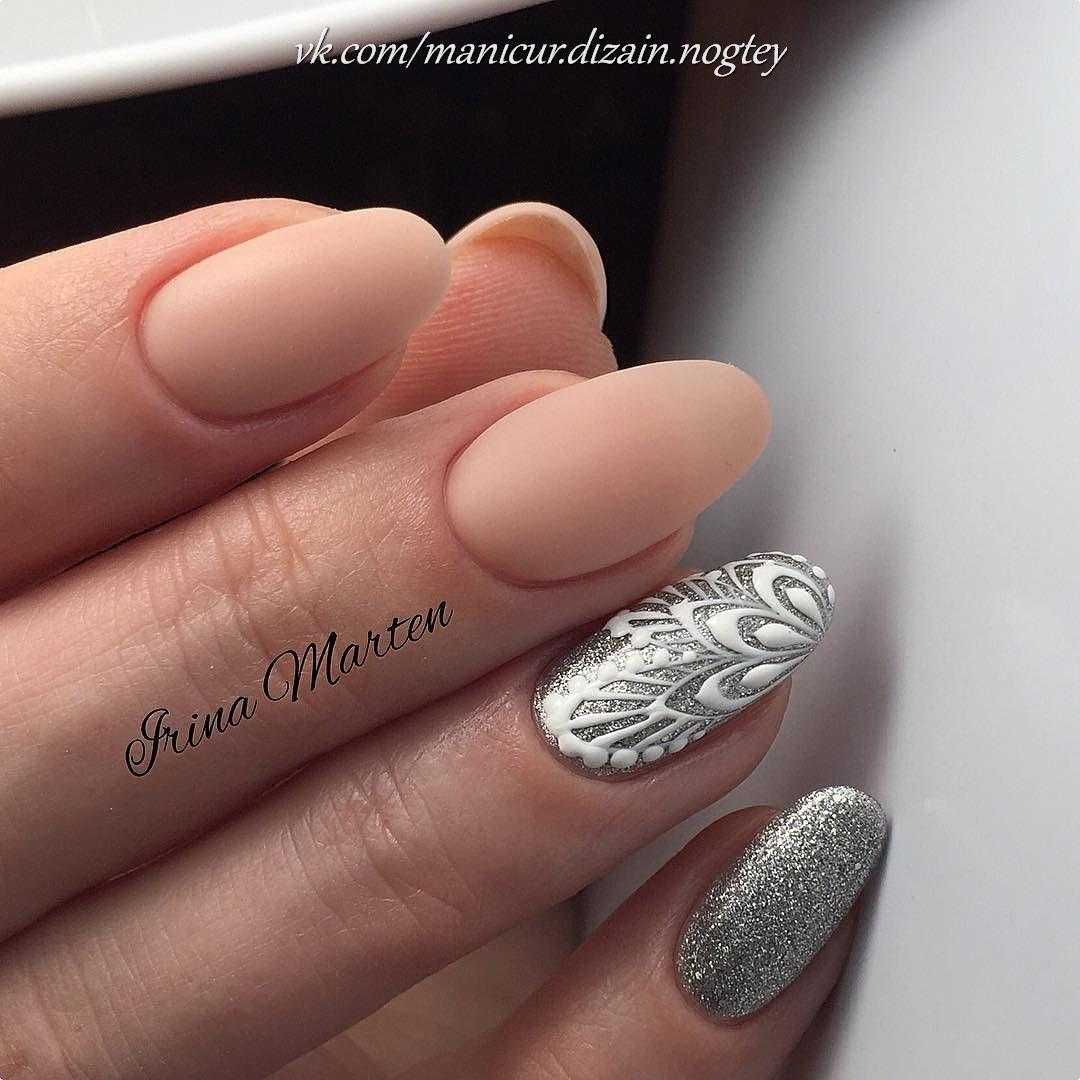 Для такого сочетания отлично подойдет дизайн френч, лунный, геометрический рисунок. Кроме того, белая вуаль на бежевом фоне смотрится празднично и может подойти для свадебного декора ногтей.
