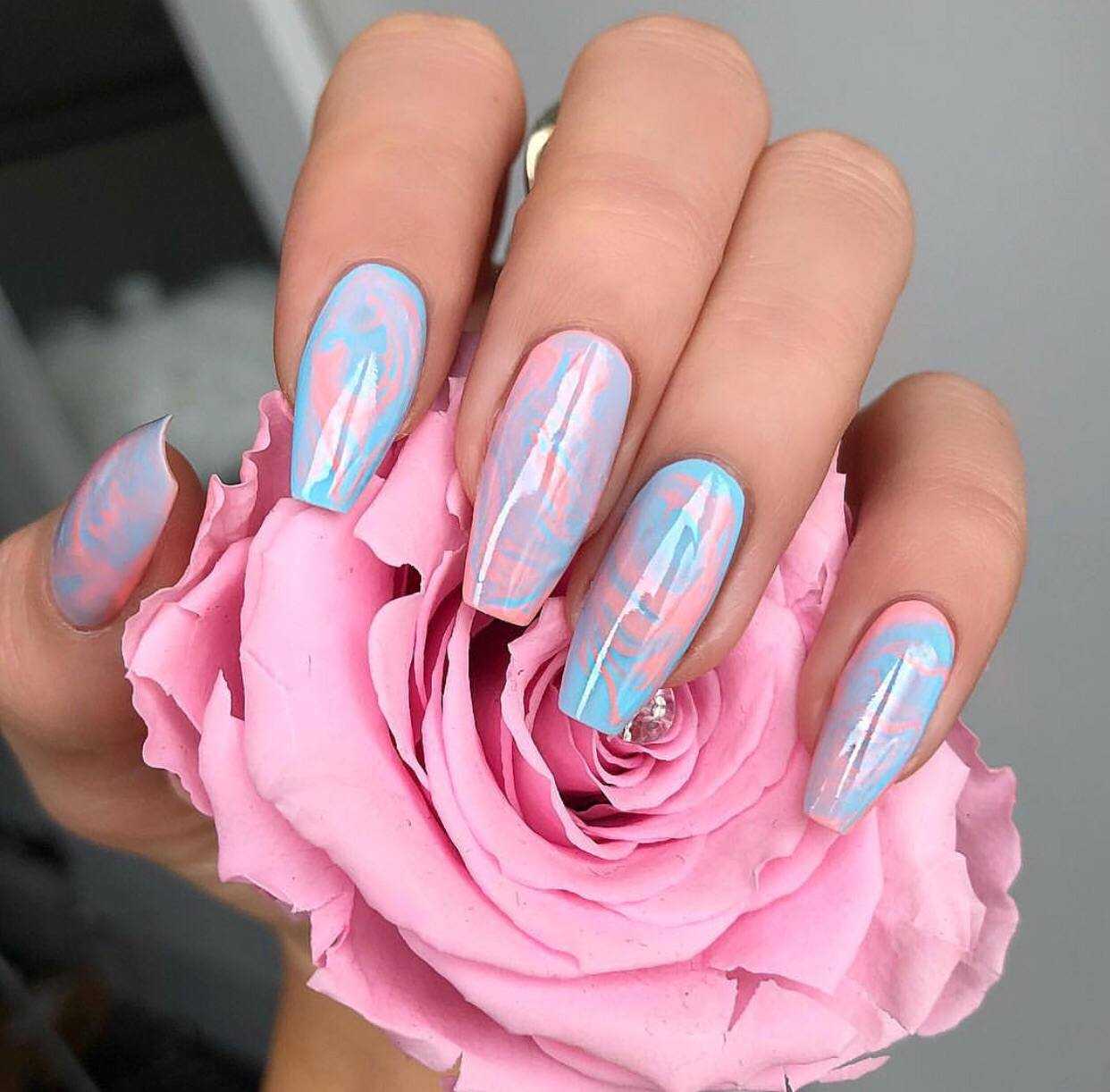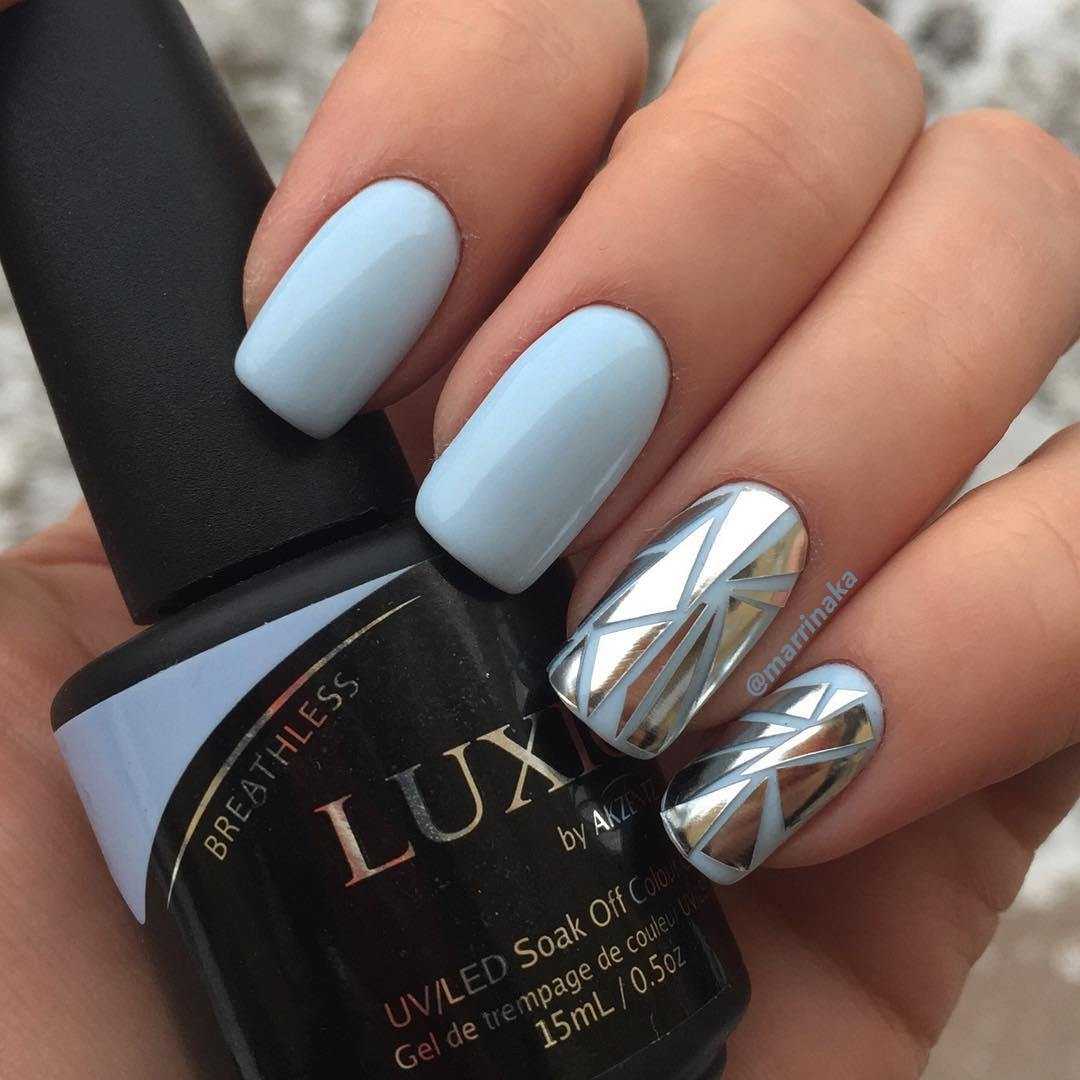 Сложное, но одновременно с этим оригинальное решение. Но опытному мастеру все по плечу, к примеру, можно сделать однотонный маникюр в серо-голубой вариации