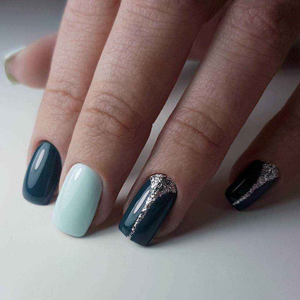 Тёмный маникюр с серебром заслуживает отдельного внимания. К тёмной базе можно добавлять несколько ногтей с серебряными блестками, или менять цвет с помощью втирки.