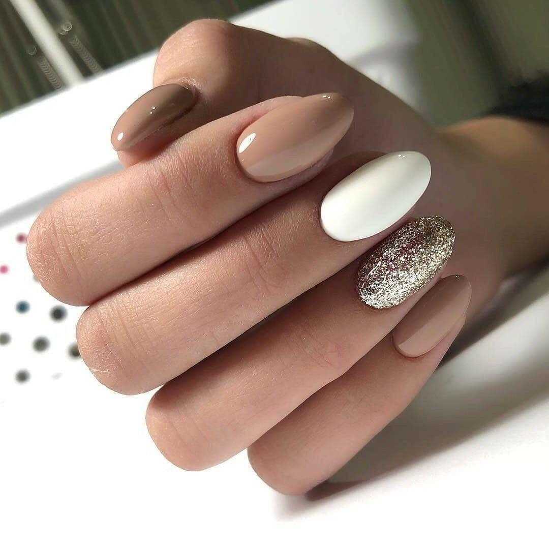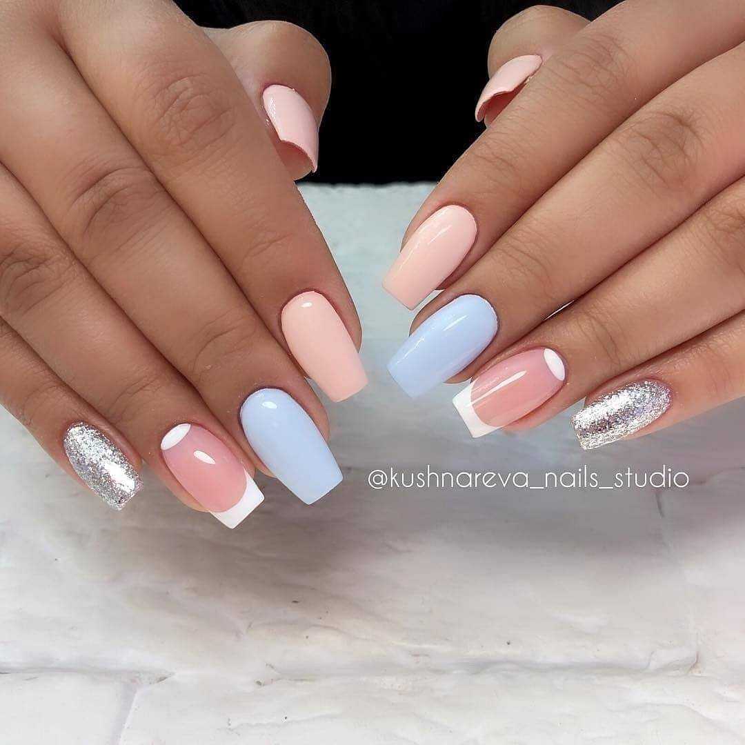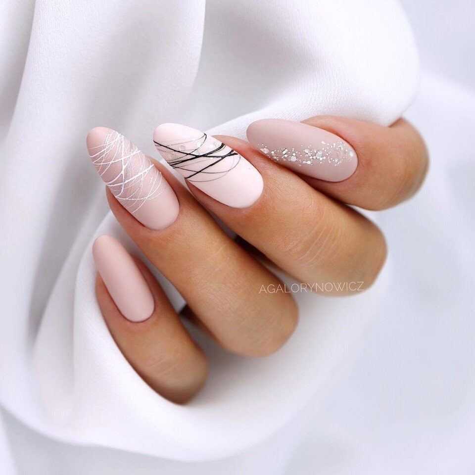 - Также модно просто чередовать нежные тона на ногтях, выделяя 1-2 блестками. Такие эффектные, но сдержанные виды нейл-арта вполне актуальны для офисных идей маникюра.