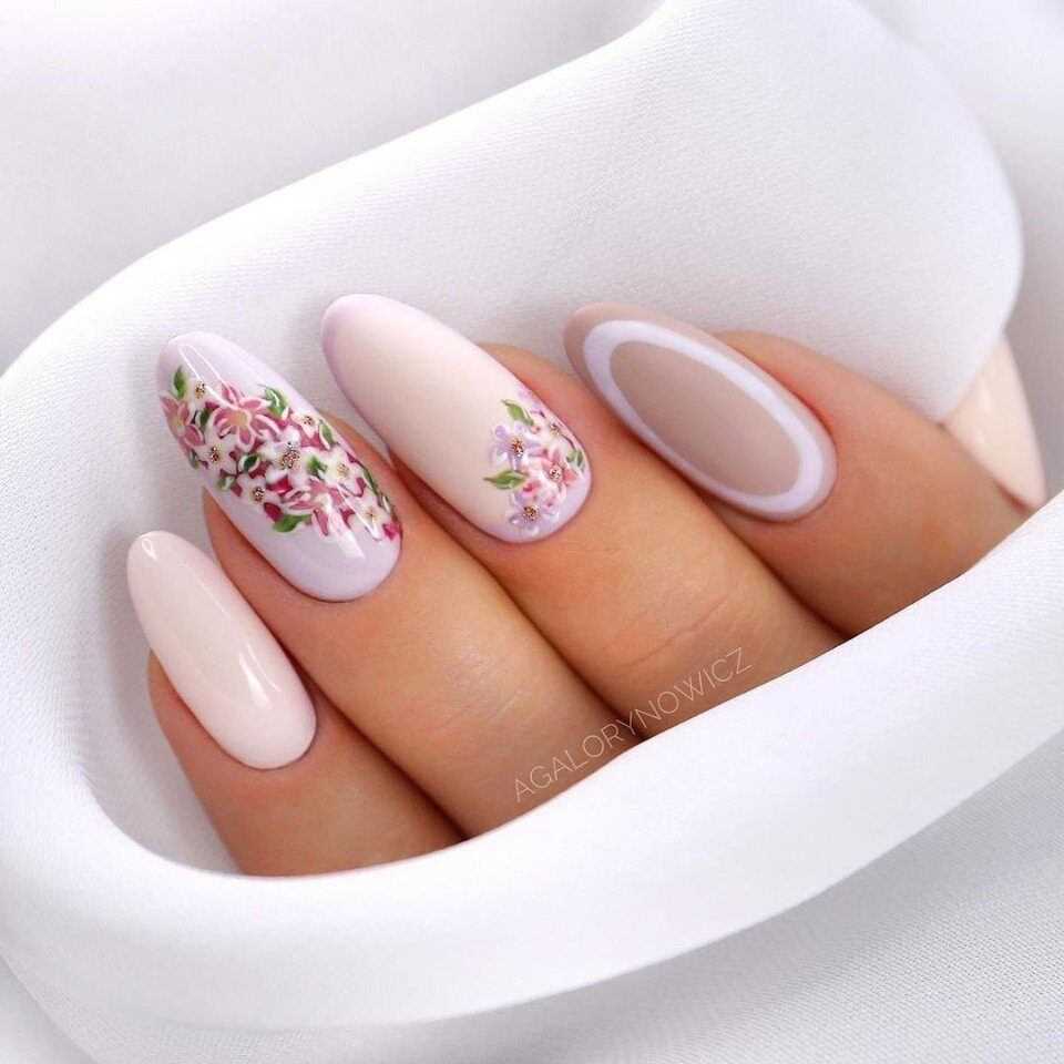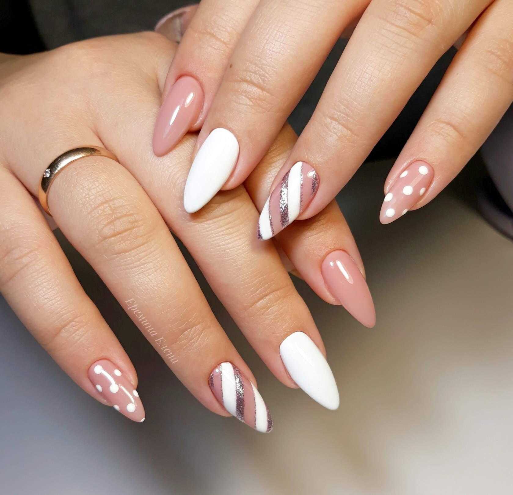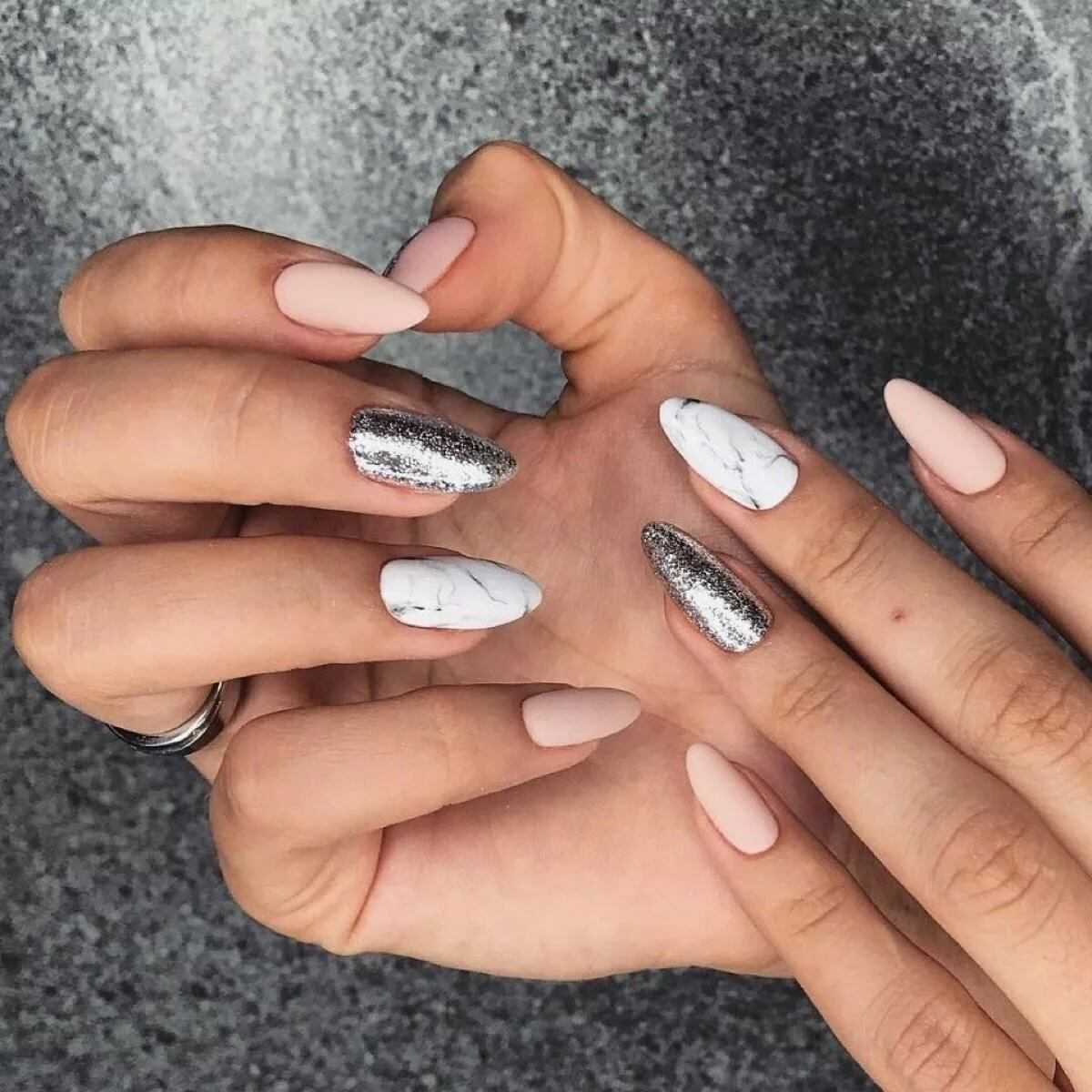 - Также модно просто чередовать нежные тона на ногтях, выделяя 1-2 блестками. Такие эффектные, но сдержанные виды нейл-арта вполне актуальны для офисных идей маникюра.