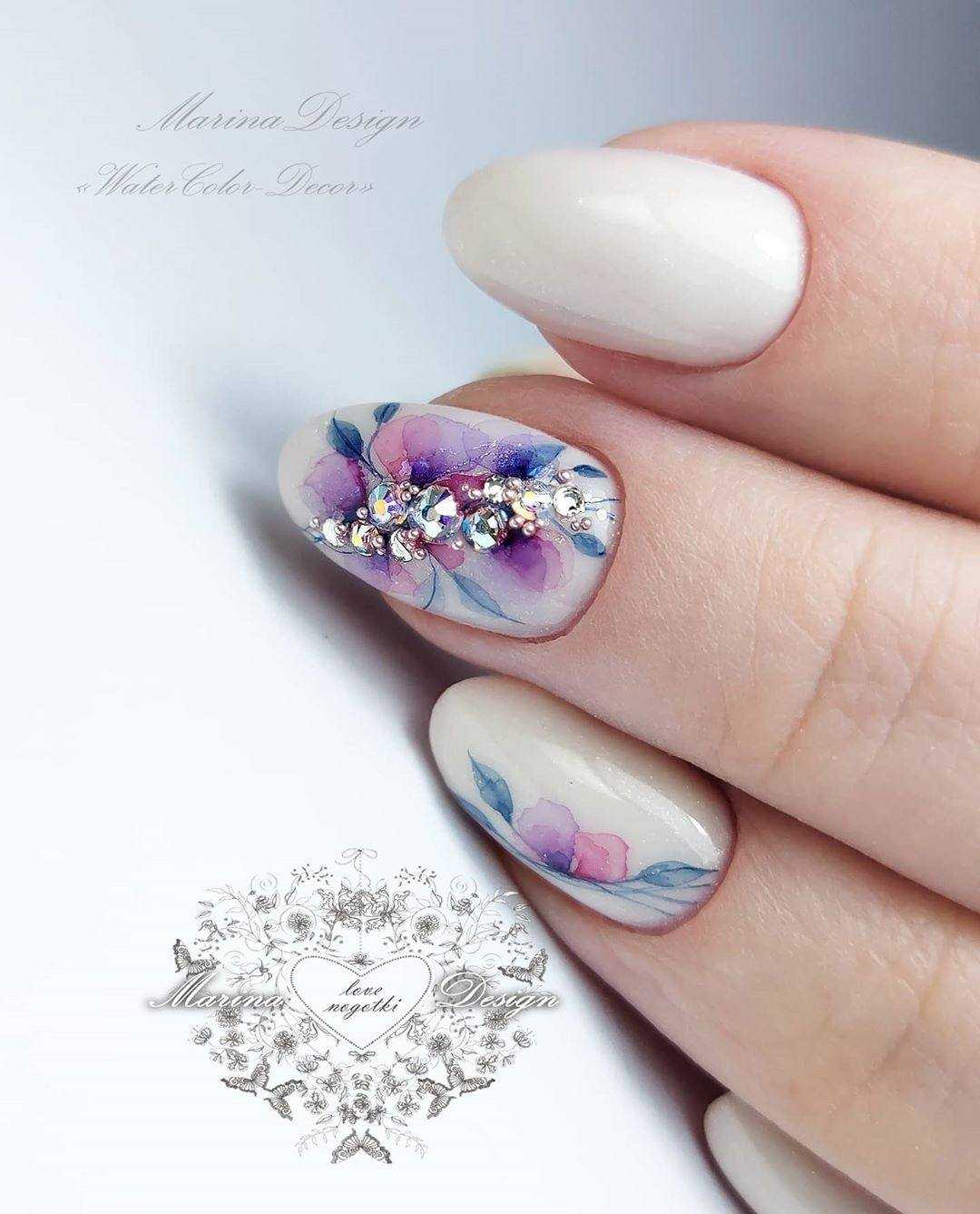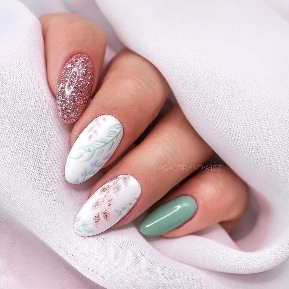 - Ещё одно любимое комбо: рисунки с блестками. Часто применяют дизайны с акварелью, цветочные и растительные мотивы, геометрию и текстуры.