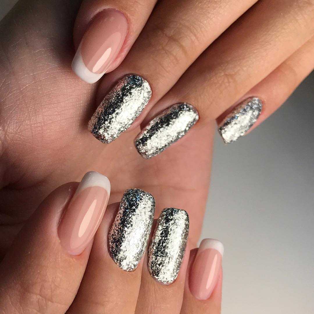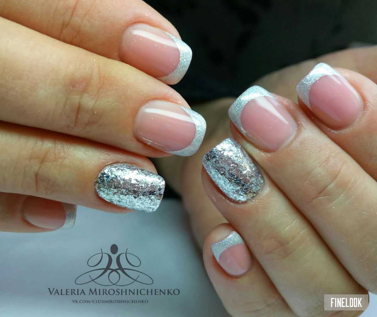 Это тот же французский маникюр, только край ногтевой пластины оформлен с помощью пайеток или напыления. Ногти с таким маникюром смотрятся очень стильно и модно. Он подойдет больше для праздников и вечеринок.