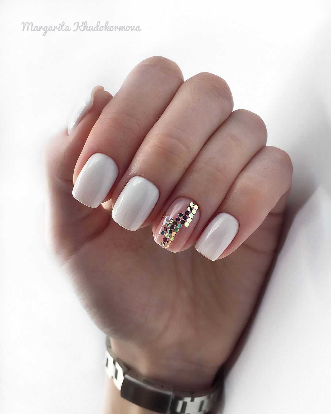 Короткая длина ногтей уже стала привычной для большинства модниц. Она позволяет экспериментировать, но при этом остается комфортной в быту. Что касается оформления, то наибольшей популярностью пользуется нейтральное покрытие в нюдовой гамме. В свою очередь, более темные оттенки лака лучше комбинировать со светлыми тонами. Это позволяет сохранить баланс и сделать маникюр актуальным. Небольшое количество блесток в данном случае используют для создания рисунка, акцента или полного покрытия. В целом, допустимы самые разные варианты. Поэтому вдохновляйтесь идеями и пробуйте для себя самые разные варианты.