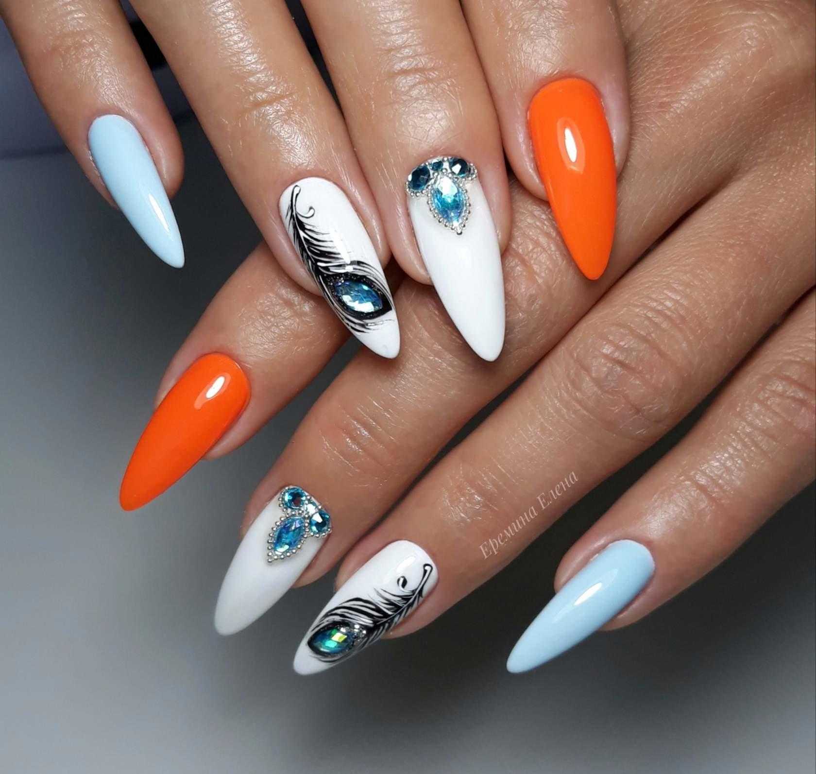 Лаки солнечных оттенков (красный, желтый, оранжевый) прекрасно дополняются блестящим декором синего цвета.