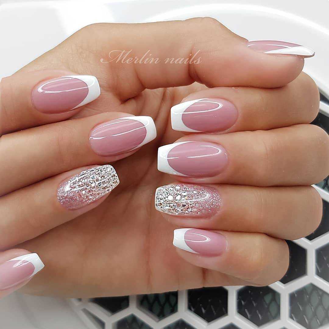 Французский маникюр с блестками – это лучшее решение для тех модниц, которые не любят слишком сложное оформление ногтей. Безусловно, данный вариант по праву можно назвать наиболее универсальным. Поскольку он точно будет хорошо сочетаться с самыми разными луками.