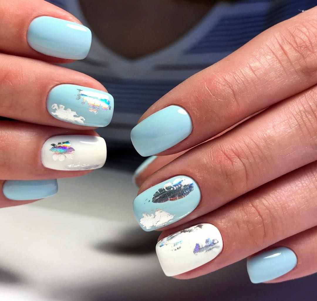 Украшение ноготков при помощи фольги смотрится довольно необычно и оригинально одновременно. Кусочки блестящего материала не повторяют форму и размер, поэтому на каждой ногтевой пластине всегда получается разный узор. Такая особенность этого декора позволяет не только смело экспериментировать, но и использовать фольгу и в качестве акцента, и как составляющую деталь дизайна. Например, можно расположить блестящие кусочки у кончика ногтя, создав при этом аналог френча или украсить весь ноготок. Также фольга часто используется в качестве подложки под рисунок или декор гелем-паутинкой.