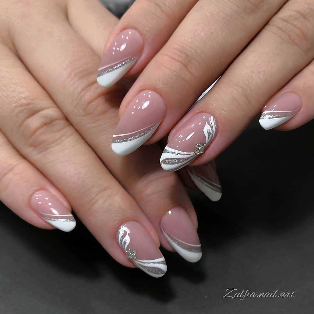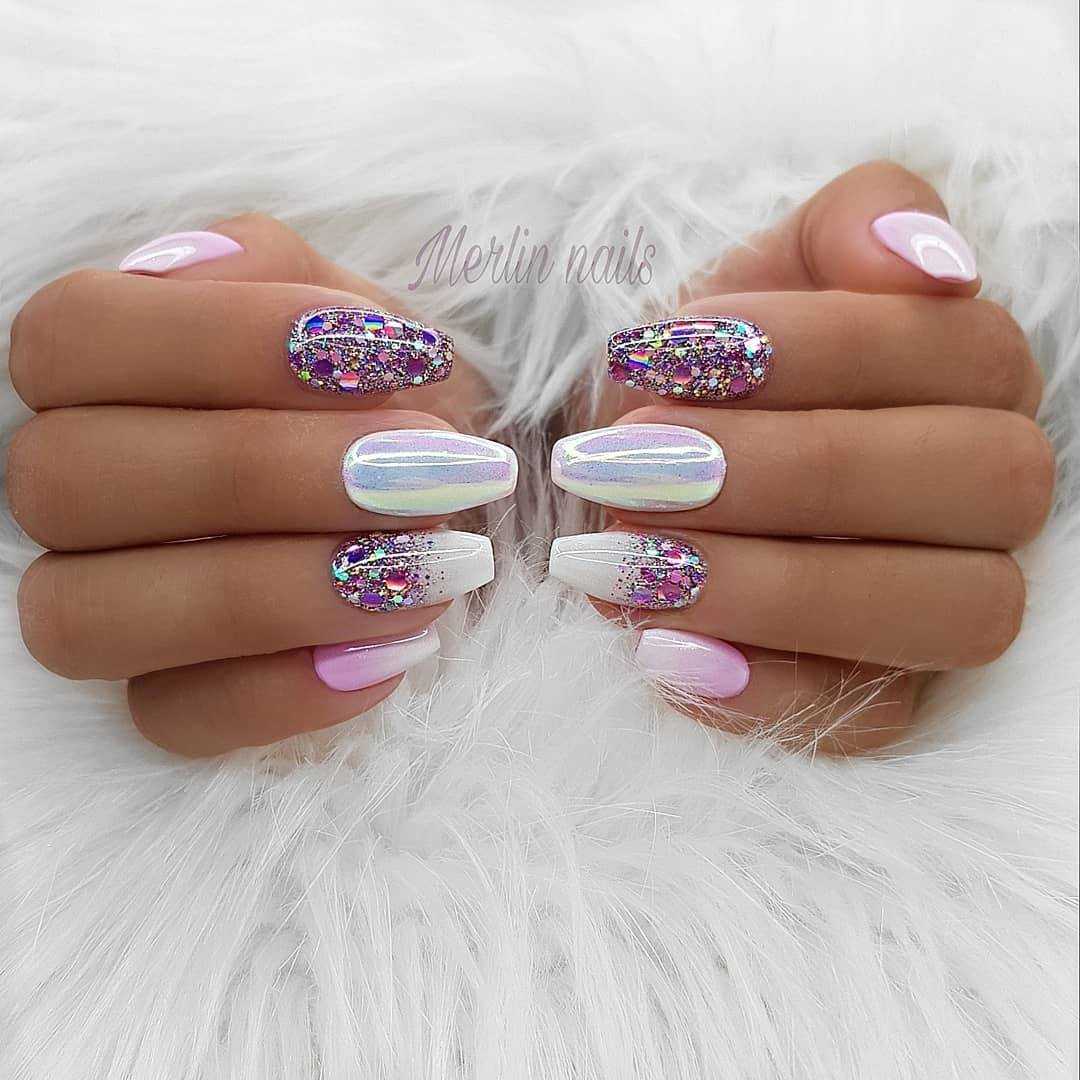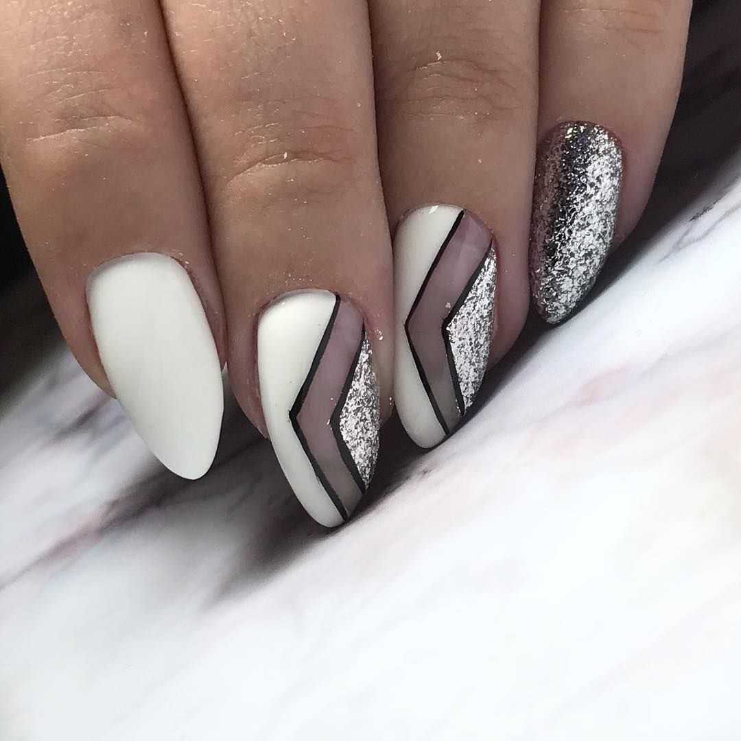 Этот популярный, стильный и красивый прием никогда не утратит своей популярности в сфере нейл-арт индустрии. Известные и модные тенденции делятся на два типа – эффект градиента белого цвета с плавным переходом в блестки, а также растягивание сверкающих блесток на ногтевой пластине, покрытой белым тоном. При этом в любом из вариантов можно использовать блестки разного цвета и формы. Омбре, выполненное при использовании блесток, очень хорошо сочетается с отдельными длинными и острыми ноготками, покрытыми полностью сверкающим декором.