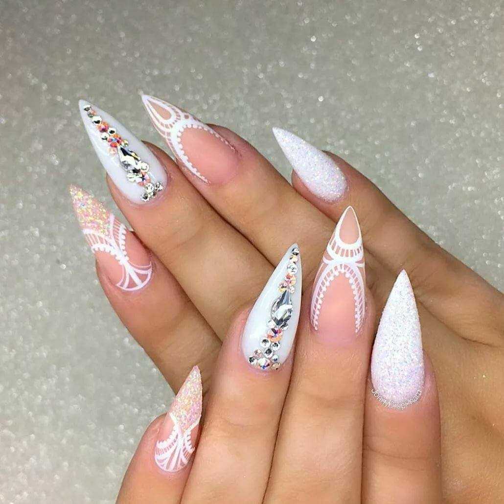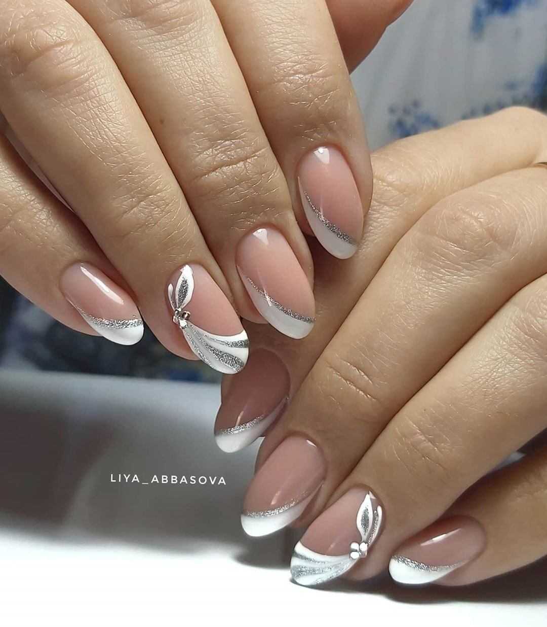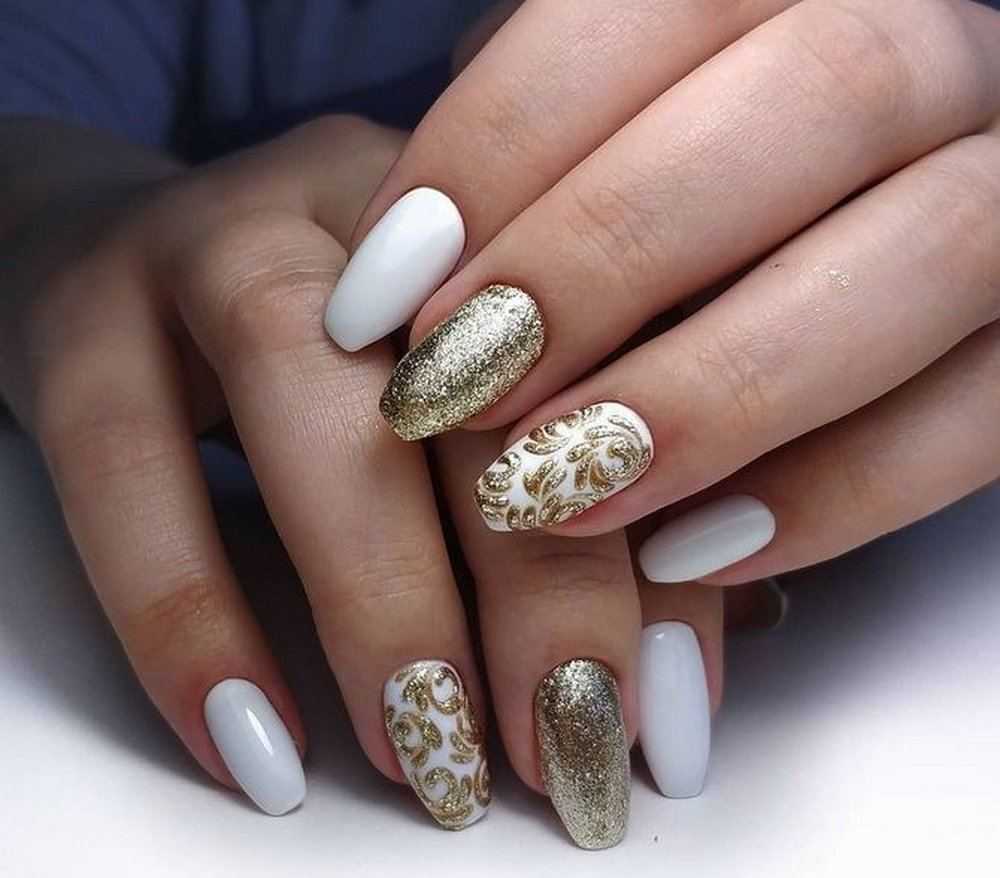 Этот популярный, стильный и красивый прием никогда не утратит своей популярности в сфере нейл-арт индустрии. Известные и модные тенденции делятся на два типа – эффект градиента белого цвета с плавным переходом в блестки, а также растягивание сверкающих блесток на ногтевой пластине, покрытой белым тоном. При этом в любом из вариантов можно использовать блестки разного цвета и формы. Омбре, выполненное при использовании блесток, очень хорошо сочетается с отдельными длинными и острыми ноготками, покрытыми полностью сверкающим декором.