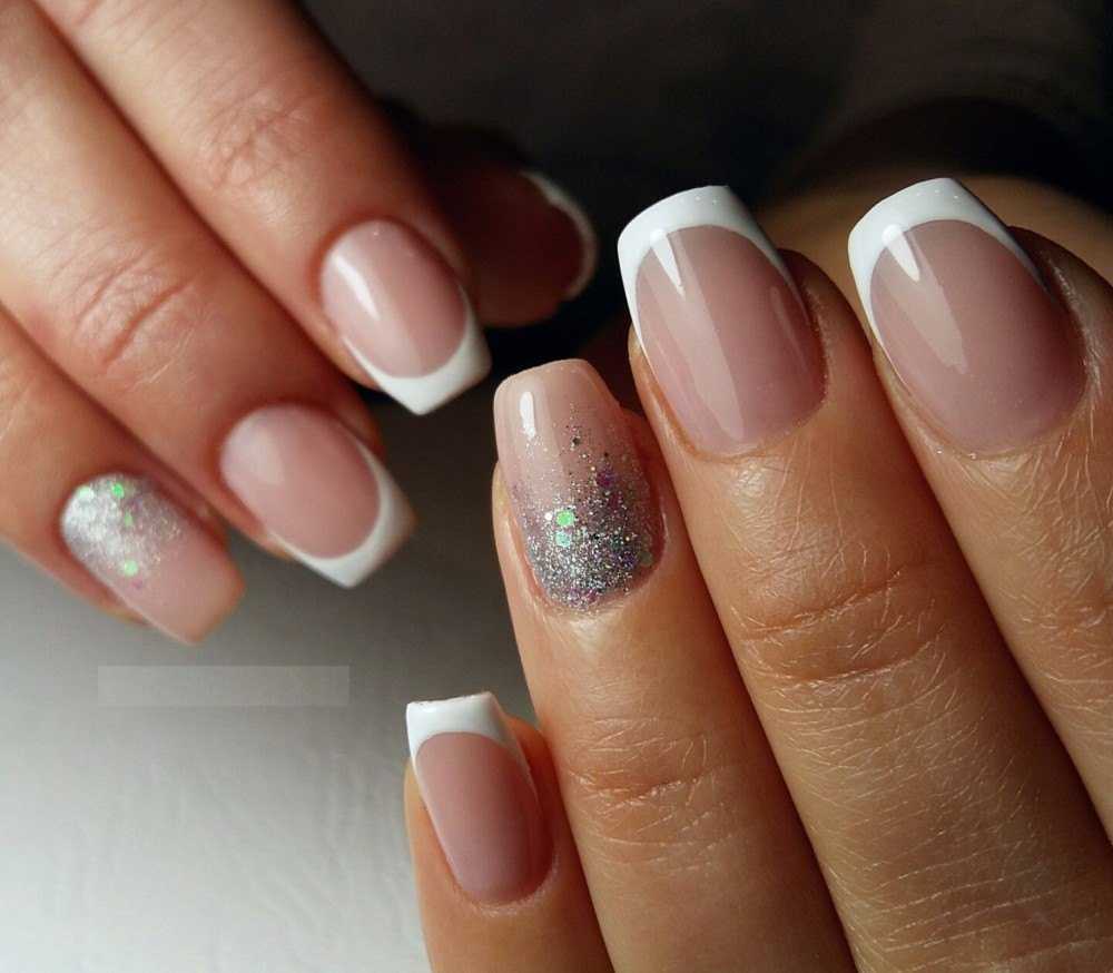 Что касается оформления блестками, то в данном случае лучше использовать их только в качестве акцента. То есть в небольшом количестве на линии улыбки, лунках или же в качестве дизайна. Благодаря такому подходу маникюр не будет перегруженным деталями.