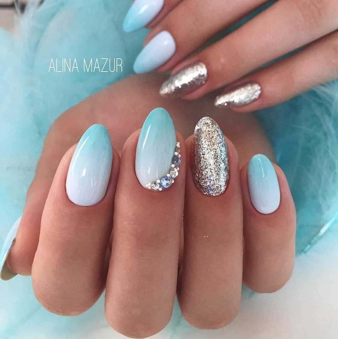 Градиент на ногтях можно выполнить двумя способами: нанести прозрачные блестки на цветное покрытие либо использовать цветной глиттер. Варианты маникюра с глиттером смотрите на фото.