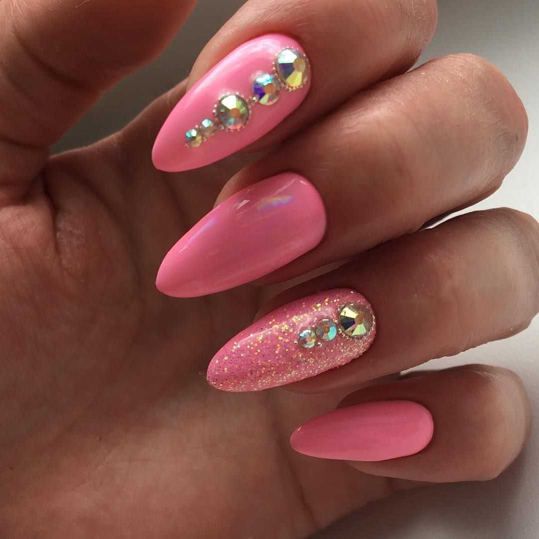 На розовом фоне великолепно смотрится выкладка стразами в виде полоски, волны, капель, обратного френча. Присмотрись к матовым нейл-артам в розовом цвете с выделением 1-2 ноготков зеркальной или жемчужной втиркой. Выполняйте на ногтях композиции из стразов разного размера и цвета, глиттера, слюды. Даже на таком ярком блестящем фоне этот декор будет смотреться вполне естественно и сдержанно.
