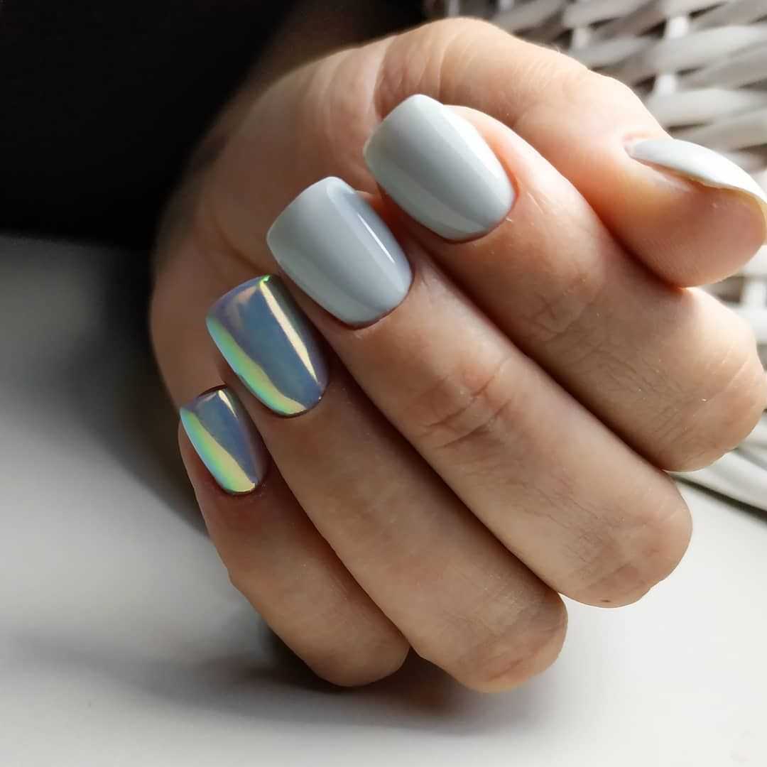 Вообще с зеркальной пудрой можно придумать различные дизайны, как по цвету, так и по содержанию. Самые красивые варианты на фото с идеями маникюра.