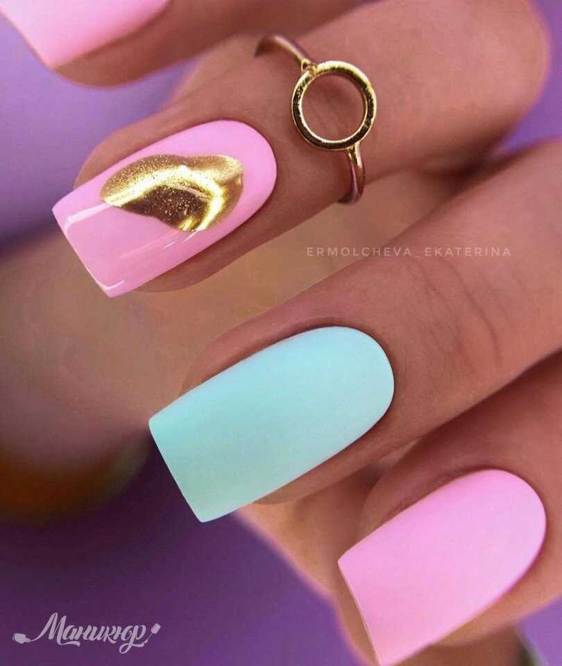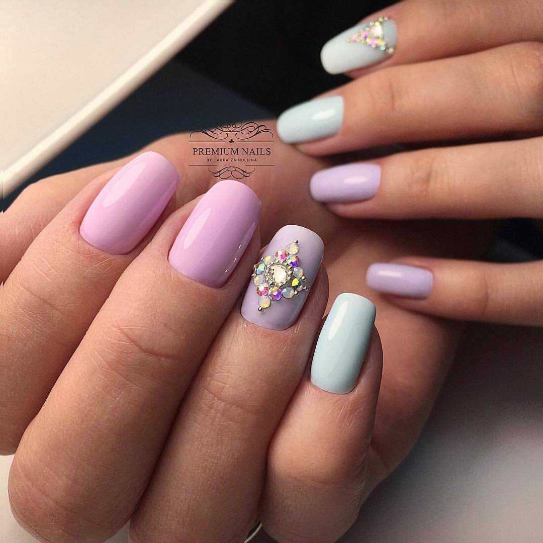 Сочетание сиреневого и бирюзы идеально подходят для создания романтичного образа. Гармоничный дизайн отлично смотрится в теплое время года, весной. Разные комбинации глянцевого и матового покрытия позволяют расширить диапазон. Нежные тона не следует сочетать с яркими.