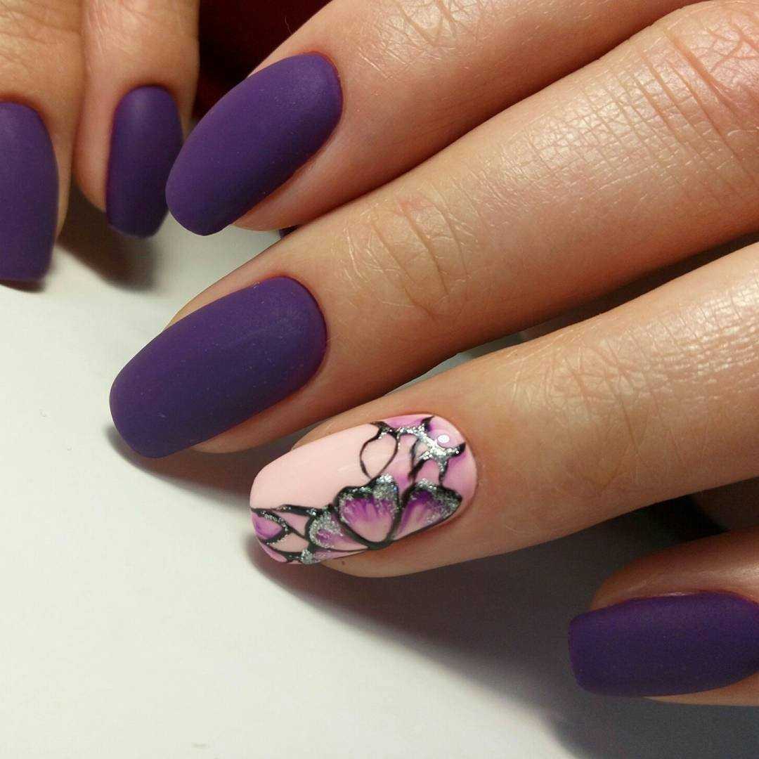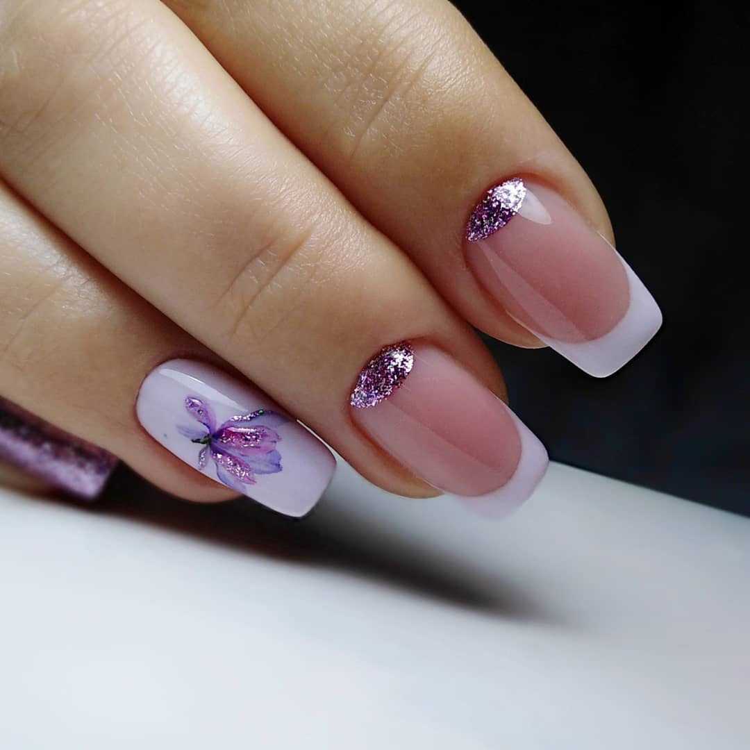 Нюдовый тона отлично сочетаются со всеми оттенками фиолетовыми. Они позволяют создавать нейл-арт на каждый день. Сочетание смотрится свежо, подходит для разных возрастов. Разнообразить дизайн помогут пенные пузырьки, стемпинг, пейзажи, растительные мотивы.