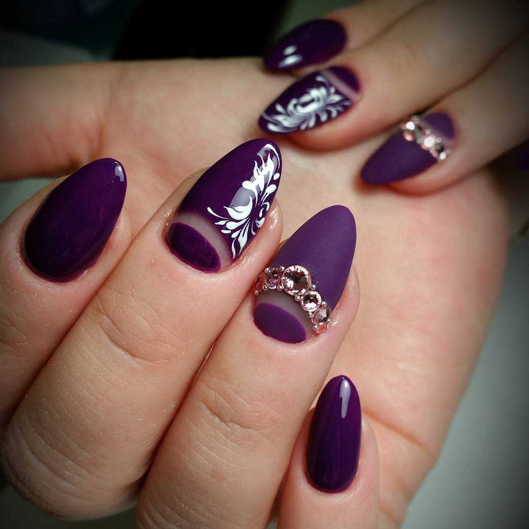Сочетание лилового и белого отлично смотрится при создании французского, лунного маникюра, геометрического дизайна. Небольшое количество страз, блесток, камушков позволяет создавать легкие эксклюзивные образы. Для вечера следует выбирать смелые цвета фиолетового, максимум декора.